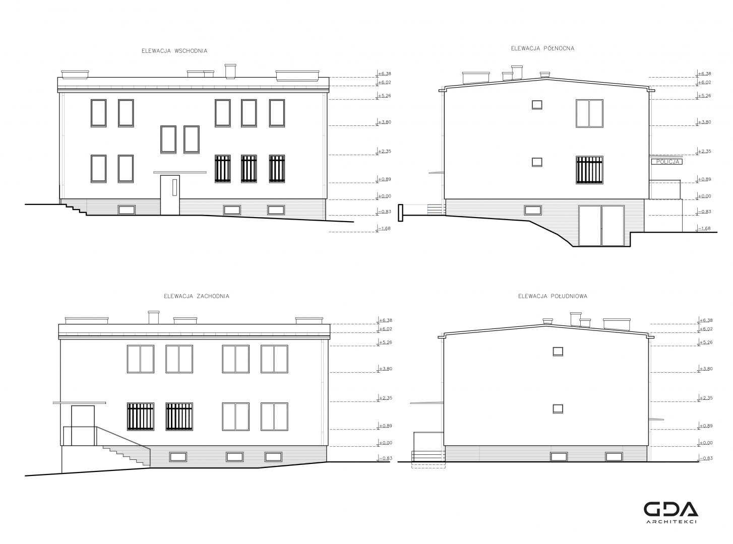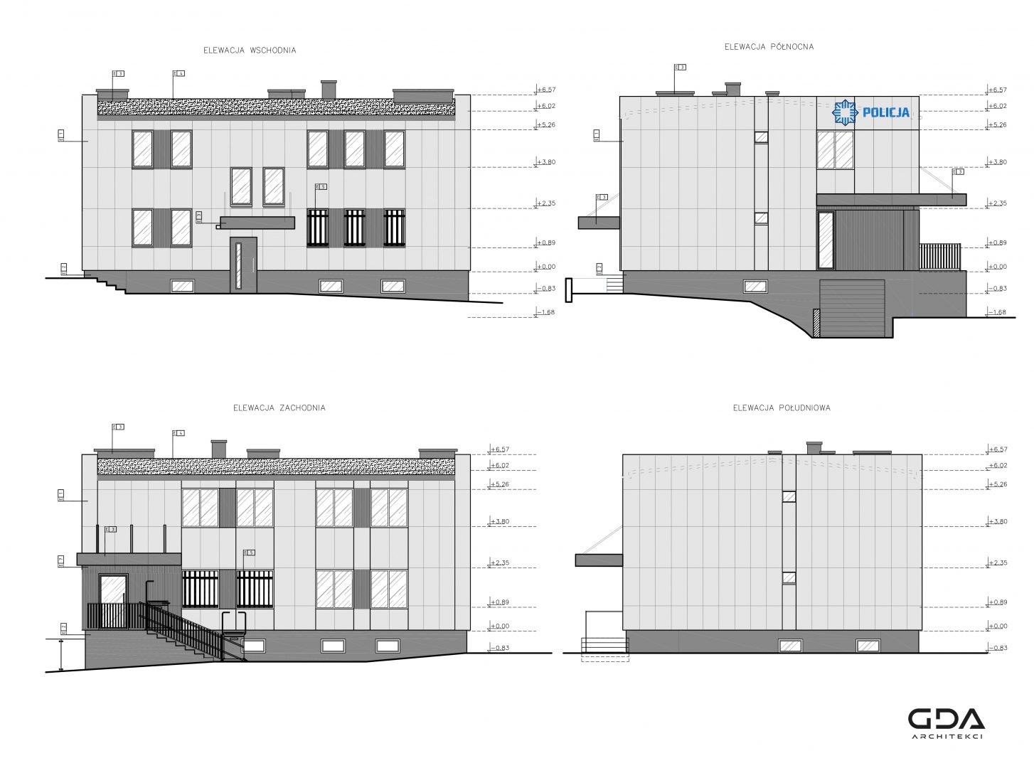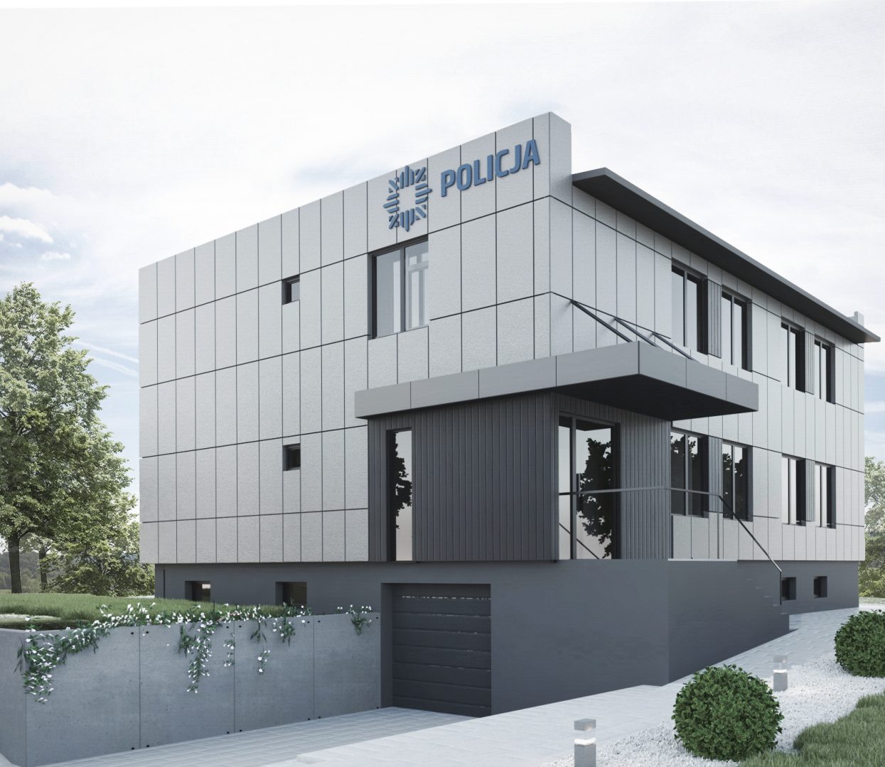 Multi-disciplinary construction and executive documentation for a thorough renovation and reconstruction of the police station in Somonino. The existing building required thermal modernization and adaptation to applicable regulations and functional requirements. The colors and materials used are in line with the image of a modern police force.