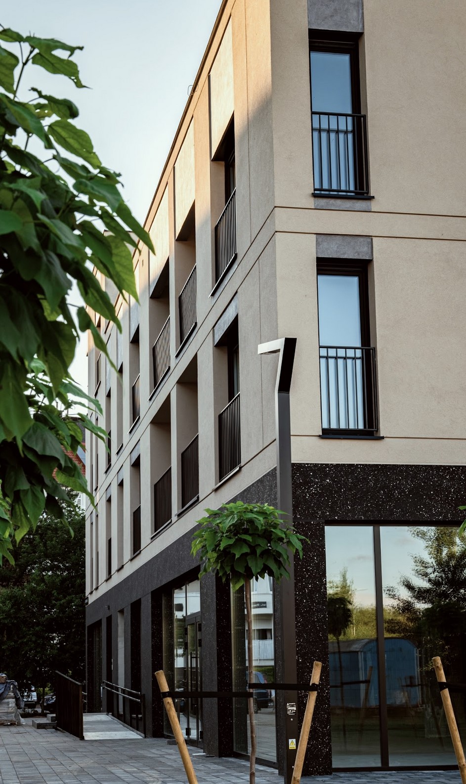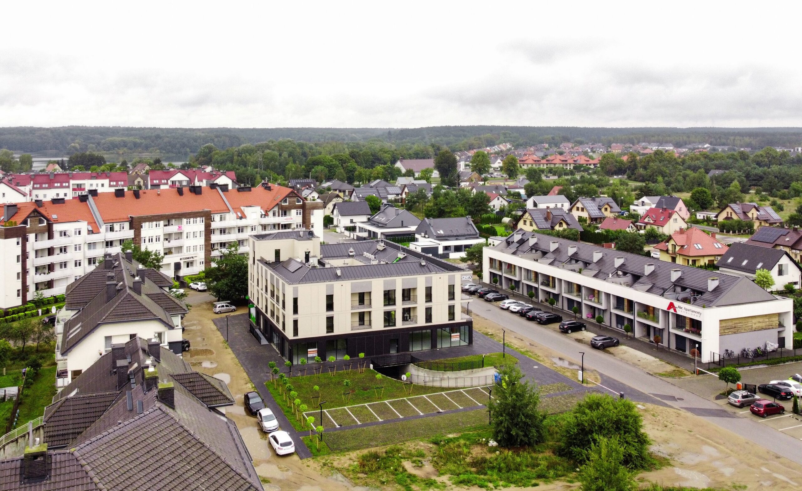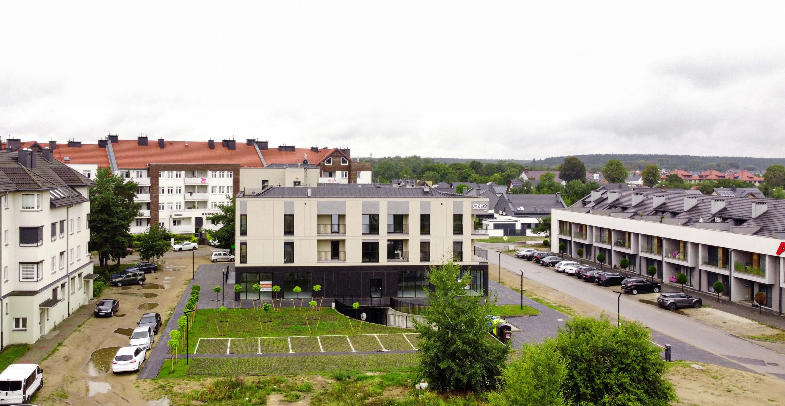 Projekt zabudowy usługowo- mieszkalnej o pow. ok. 3 000 m2 PC. Architektura budynku wynika z zapisów MPZP, który za pomocą linii zabudowy wyznaczał kształt budynku, dzięki czemu w jego wnętrzu powstało nieduże patio. Wspomniane patio dostarcza nie tylko naturalnego oświetlenia ale i jest elementem, wokół którego została zaprojektowana główna komunikacja wewnątrz budynku. Dla planistów miejskich należą się słowa uznania za dopuszczenie dominanty w postaci dodatkowej kondygnacji na narożniku, która w bardzo korzystny sposób wpisuje się w zastany układ urbanistyczny.