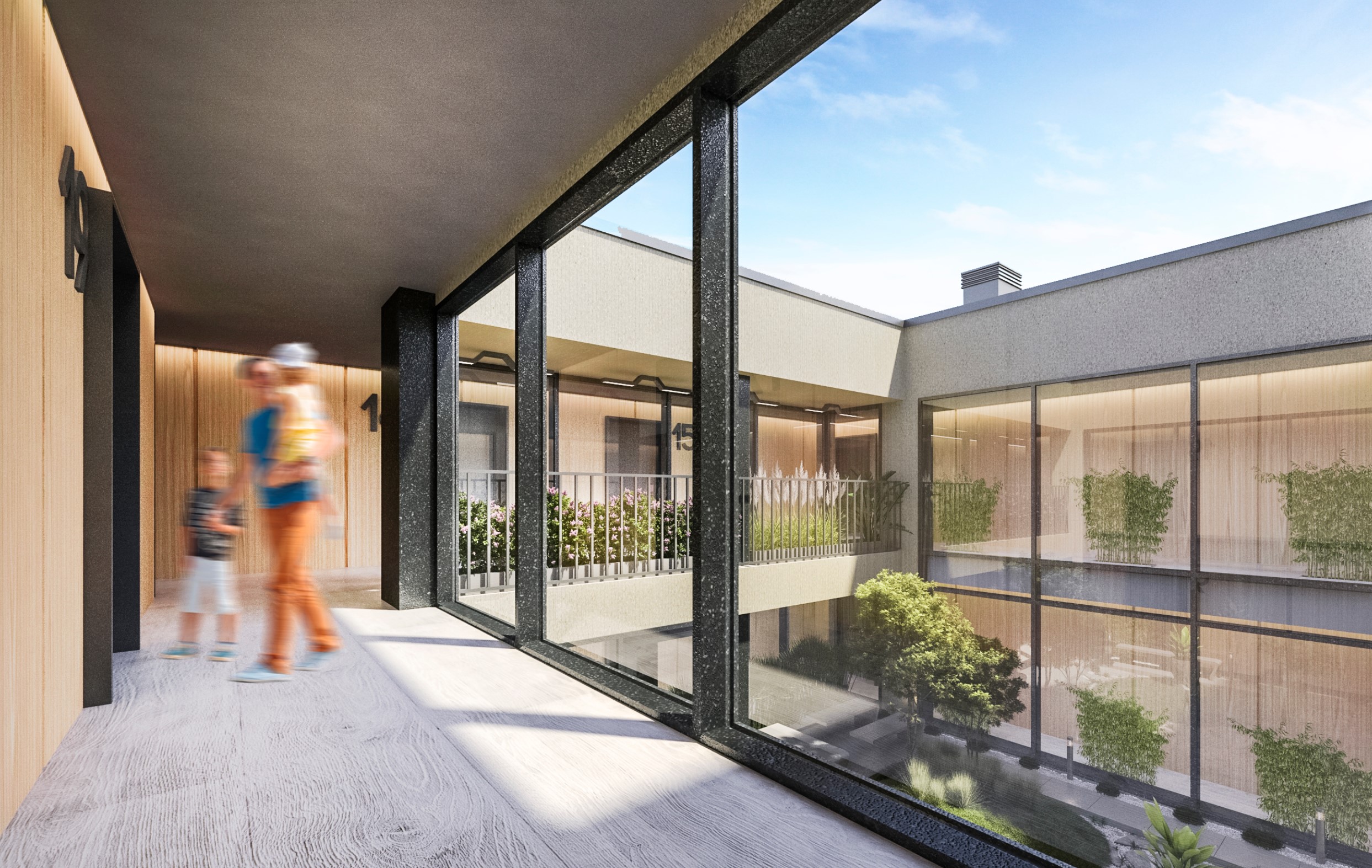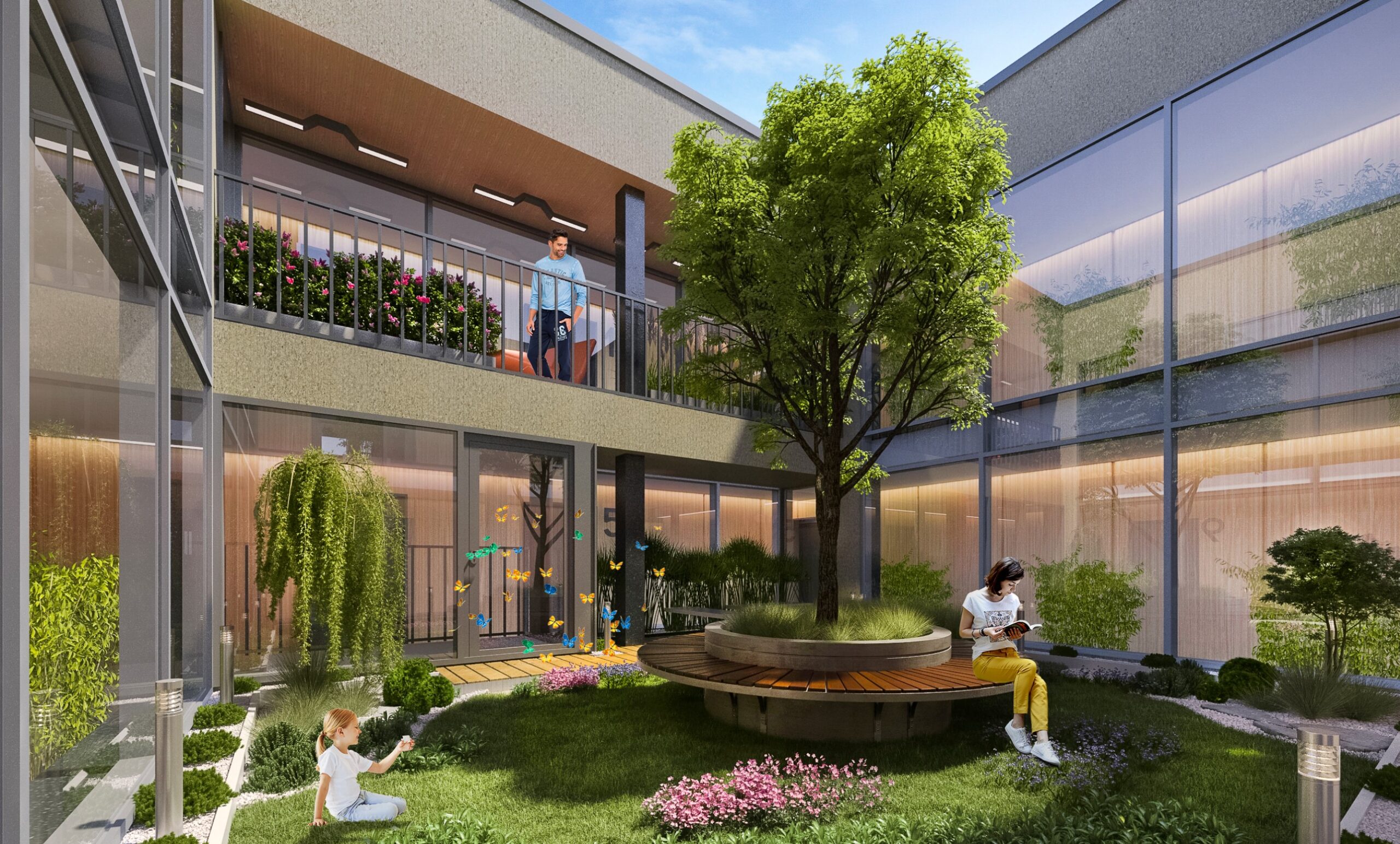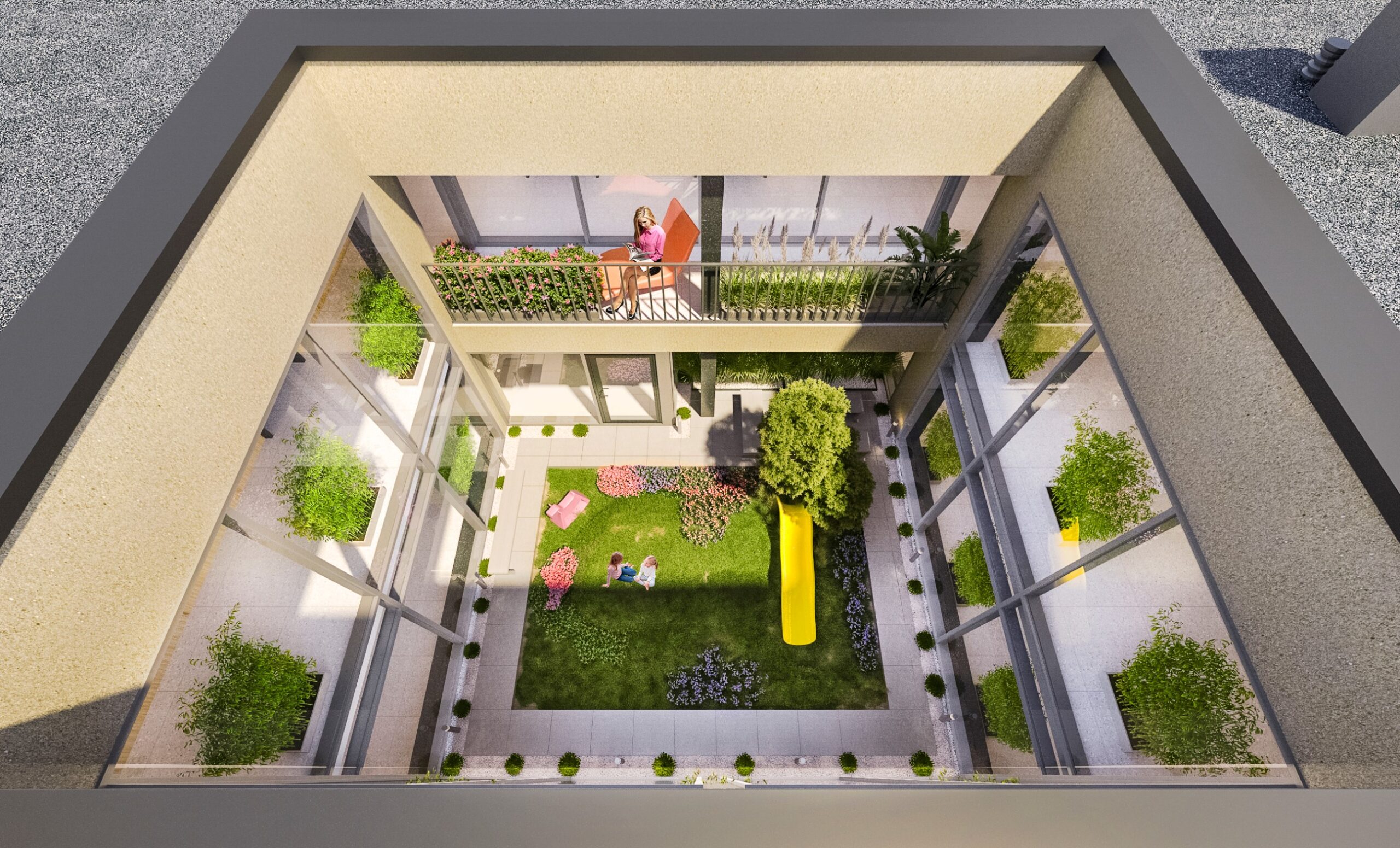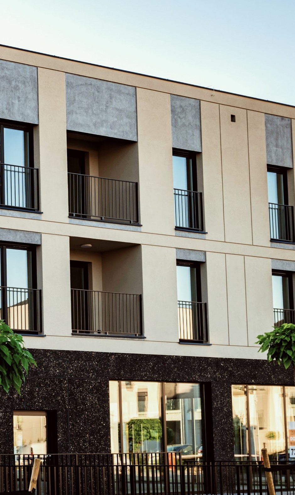 Projekt zabudowy usługowo- mieszkalnej o pow. ok. 3 000 m2 PC. Architektura budynku wynika z zapisów MPZP, który za pomocą linii zabudowy wyznaczał kształt budynku, dzięki czemu w jego wnętrzu powstało nieduże patio. Wspomniane patio dostarcza nie tylko naturalnego oświetlenia ale i jest elementem, wokół którego została zaprojektowana główna komunikacja wewnątrz budynku. Dla planistów miejskich należą się słowa uznania za dopuszczenie dominanty w postaci dodatkowej kondygnacji na narożniku, która w bardzo korzystny sposób wpisuje się w zastany układ urbanistyczny.