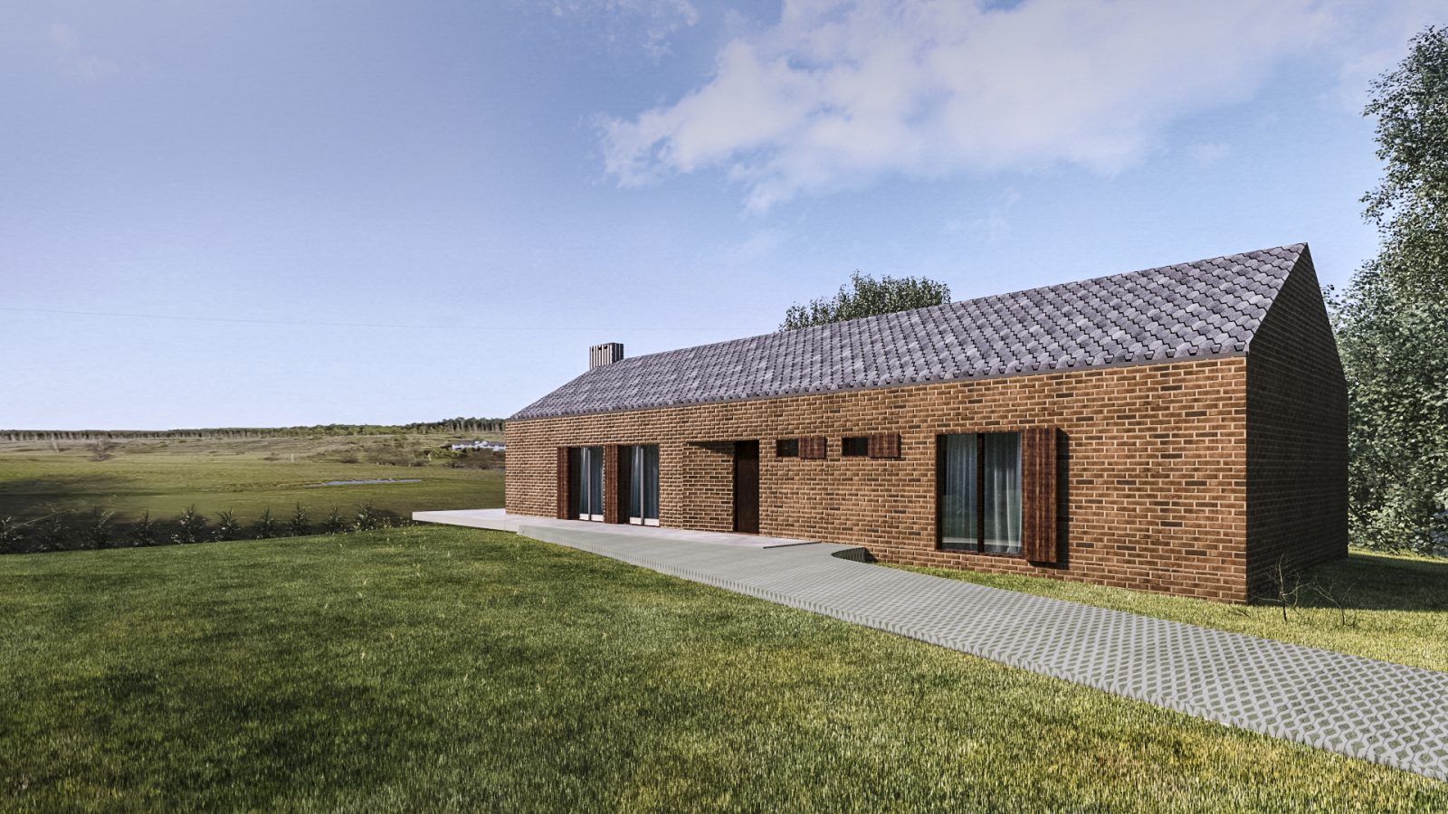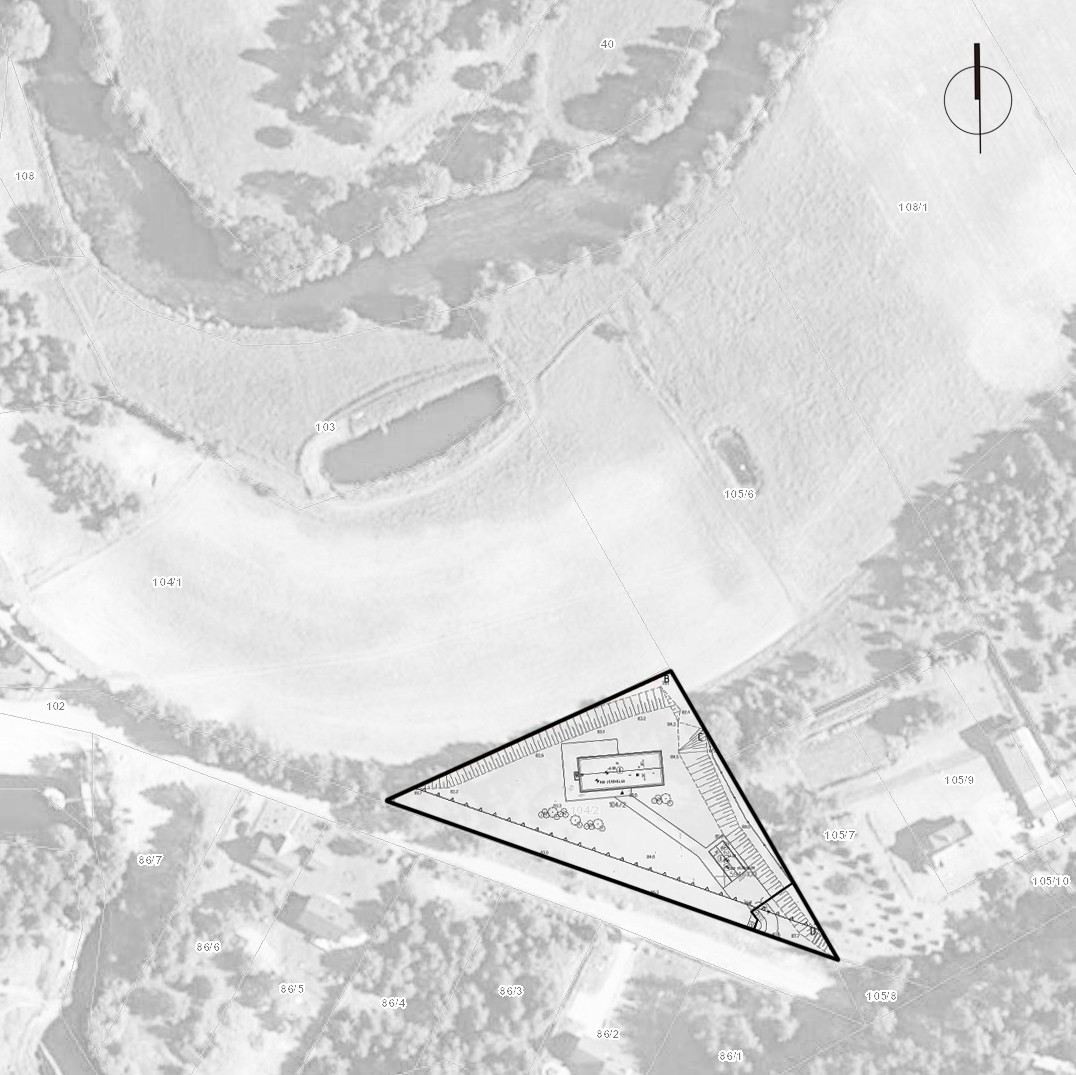 Przedmiotem inwestycji jest dom wakacyjny z garażem wolno stojącym zlokalizowany we wsi Stara Rzeka, gm.Osie. Przedmiotowa działka o pow. 3700m2 posiada kształt trójkąta, charakteryzuje się niepowtarzalnym widokiem na rzekę oraz dużym spadkiem w kierunku północno-zachodnim. Projektowany budynek usytuowany jest elewacją frontową do najdłuższego boku działki a jego forma oraz materiały nawiązują do tradycyjnej architektury regionu ( Bory Tucholskie). Trójwarstwową elewację zaprojektowano z cegły pełnej w naturalnym odcieniu. Zastosowano również okiennice ze sterowaniem automatycznym chroniące przed przegrzaniem budynku w lecie oraz zapewniające bezpieczeństwo poza sezonem. Z części dziennej, w której mieści się przestronny salon z kuchnią i jadalnią rozpościera się widok na dolinę. W bezpośrednim sąsiedztwie kuchni zlokalizowano spiżarnię oraz łazienkę z kotłownią. W części prywatnej znajdują się sypialnie oraz pokój kąpielowy, z którego można nie tylko podziwiać widok, ale po otwarciu okien również słuchać płynącej w oddali rzeki.