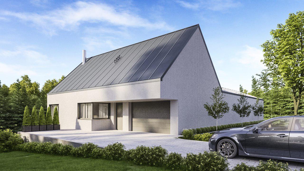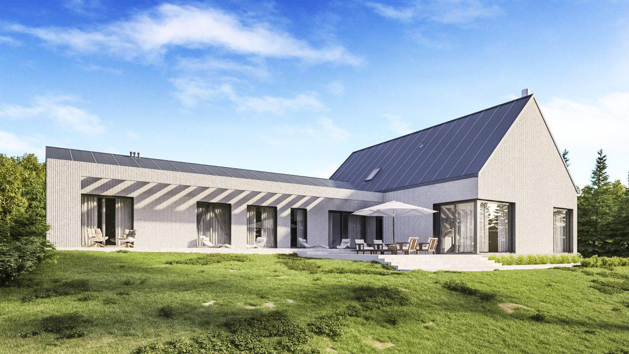 Projekt parterowego domu o pow. 190 m2 zlokalizowanego na działce z widokiem na las. Myślą przewodnią oraz intencją projektową było zapewnienie mieszkańcom 100% intymności i prywatności. Pomieszczenia zlokalizowane są w sposób zapewniajacy optymalne wykorzystanie nasłonecznienia oraz walorów działki. W części pólnocnej zlokalziowano garaż, komunikację , kuchnię oraz pomieszczenia techniczne. W części południowej zlokalizowany jest ogród z tarasem łączącym wszystkie pokoje domowników mające ekspozycję na widok, słońce i las. W budowie użyto prostych materiałów, ale przywiązano dużą uwagę do stolarki okiennej.