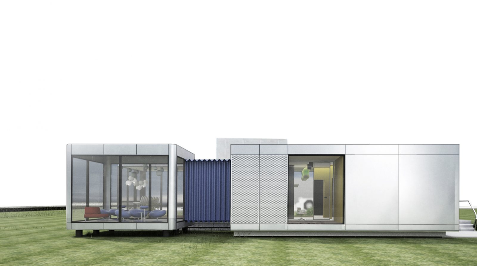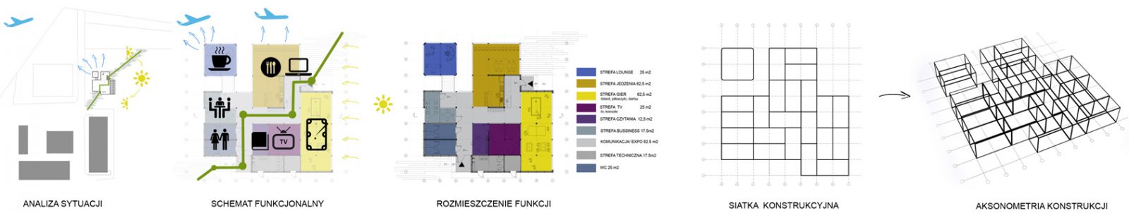 Koncepcja budynku modułowego inspirowana jest klasycznymi samolotami, a dokładnie aluminiowym,lśniącym w słońcu poszyciem, z którego były wykonane. Koncepcja opiera się na prostej, surowej bryle wykończonej w minimalistyczny sposób oraz ekspresyjnym wnętrzu. Obiekt wykończony panelami Bio-luminium, produkowanymi przez amerykańską firmę Coverings Etc. Materiał ten zasugerowaliśmy ponieważ uzyskiwany jest z recyklingu – poszycia samolotów wycofofanych z użytku. Materiał ten może być zastąpiony panelami z blachy tytan-cynk. Wnętrze obiektu podzielone jest na kilka stref wg schematu rozmieszczenia funkcji. Strefa gier umieszczona od strony południowej, niewymagająca dodatkowego oświetlenia strefa gier video w centralnej części budynku. Z salki spotkań, strefy lounge oraz strefy jadalni mamy widok w kierunku lotniska. Przeszklenia fasady rozmieszczono wg funkcji oraz stron świata.Najwięcej przeszkleń na wschodzie i południu, najmniej na północy oraz zachodzie. Budynek sugerujemy wykonać w standardzie pasywnym lub energooszczędnym na płycie fundamentowej. Ogrzewanie za pomocą np. gruntowej pompy ciepła wraz z rekuperacją i wspomaganej za pomocą kolektorów słonecznych. Obiekt ocieplony 20cm wełny mineralnej ( ściany) i 30cm (dach).