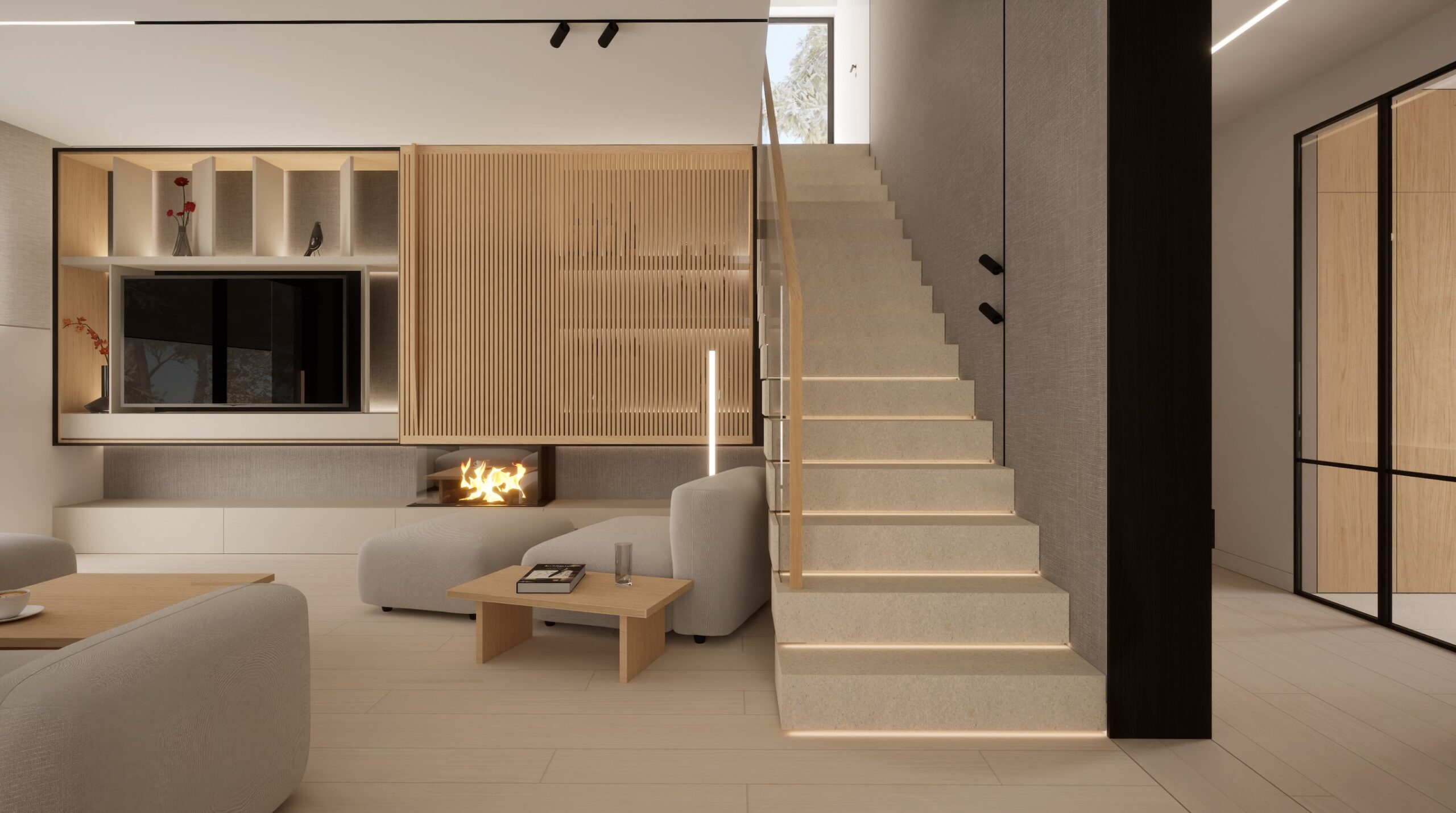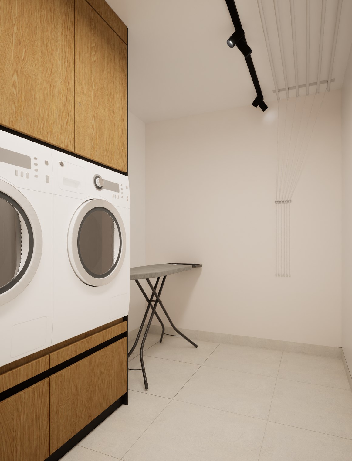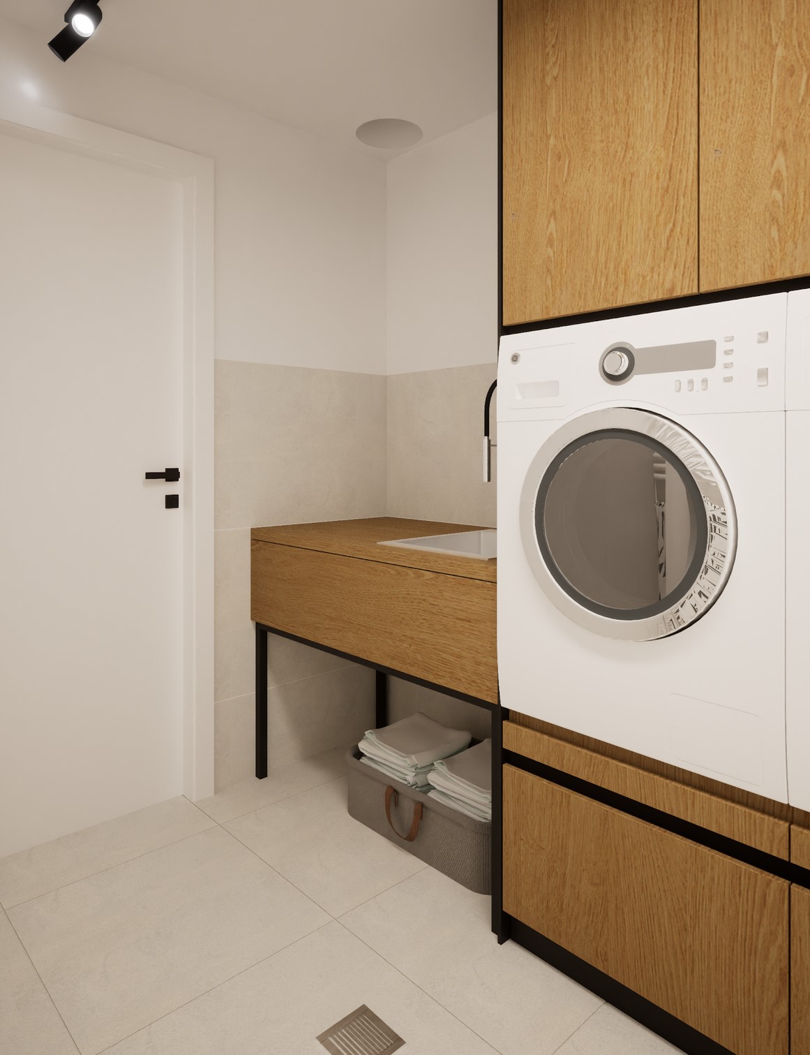 Projekt stworzony z myślą o komforcie i funkcjonalności. Otwarty układ pomieszczeń, jasne wykończenia i naturalne materiały sprawiają, że wnętrze jest przestronne i przyjazne. Przemyślane rozwiązania, takie jak ukryte zabudowy i spójne oświetlenie, podkreślają nowoczesny charakter całości. Idealne miejsce do życia w harmonii z codziennością.