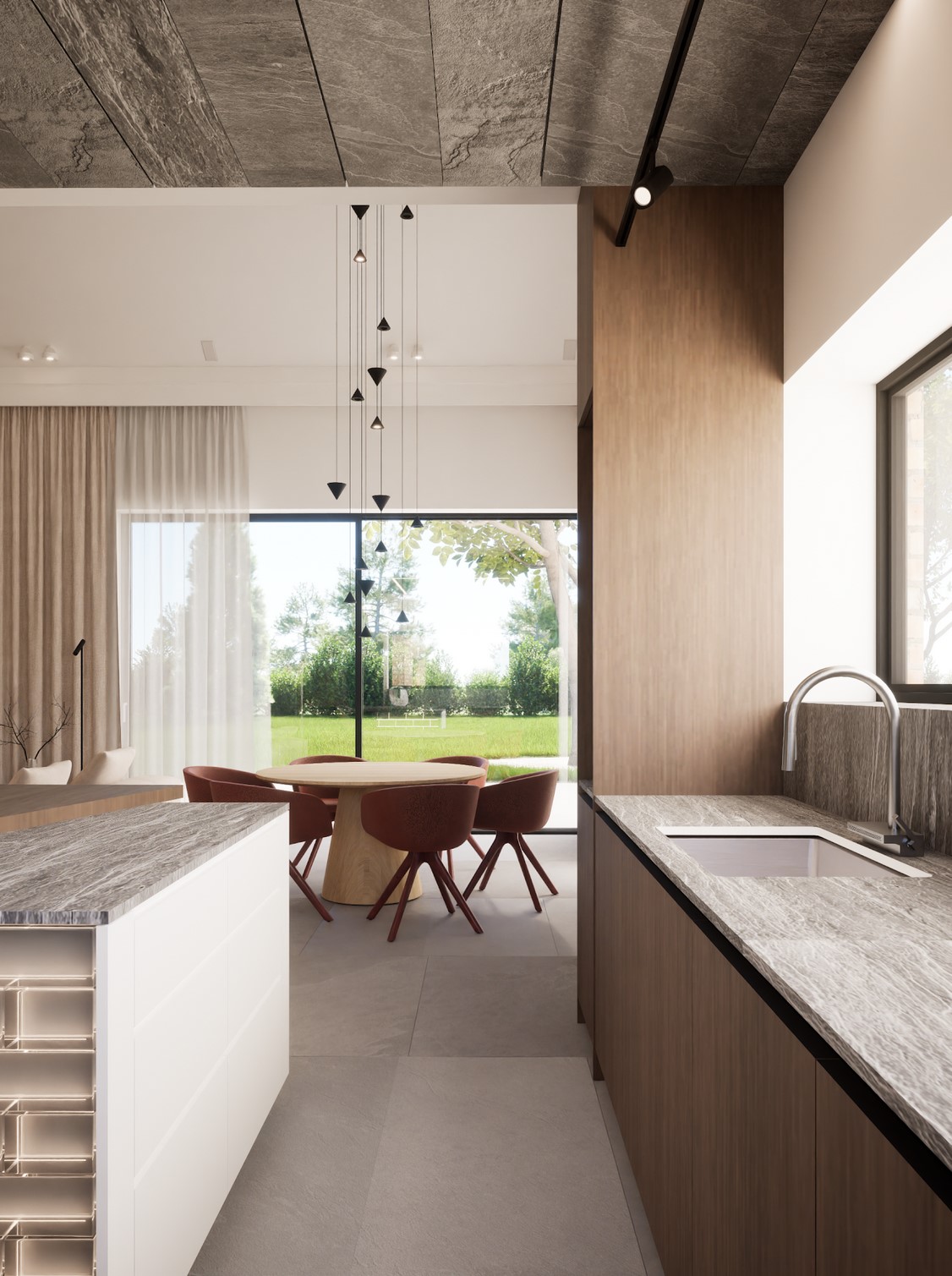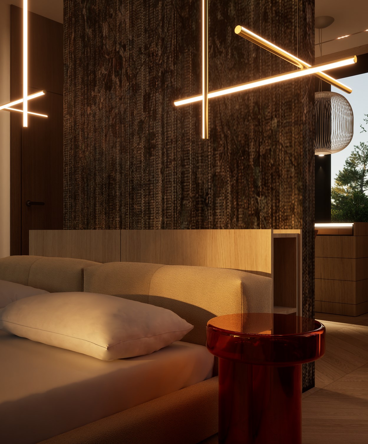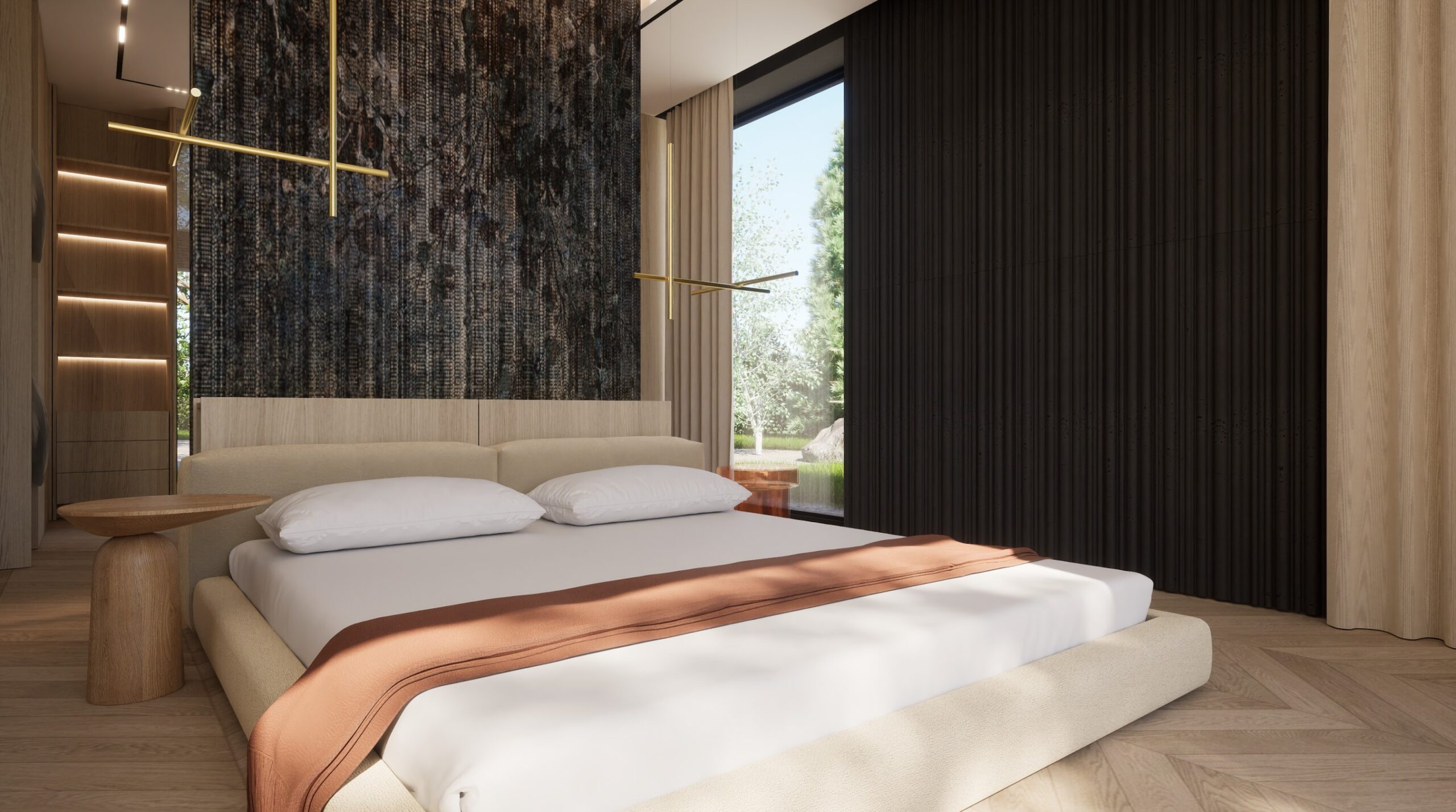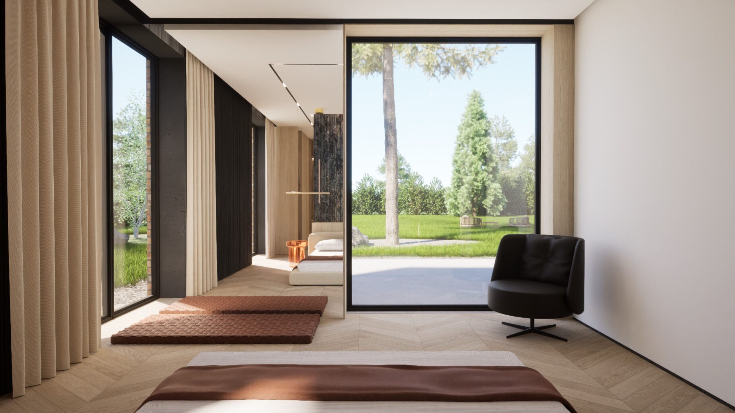 Ten projekt wnętrza to harmonijne połączenie nowoczesnego minimalizmu z ciepłem naturalnych materiałów. Ciepły, orzechowy odcień drewna zestawiony z surowym kamieniem nadaje przestrzeni wyrafinowany, a zarazem przytulny charakter. Centralnym punktem strefy dziennej jest funkcjonalna kuchnia z efektowną wyspą, subtelnie podświetloną szklanymi cegłami. Otwarta przestrzeń salonu i jadalni płynnie łączy się z otoczeniem dzięki dużym przeszkleniom, które wypełniają wnętrze naturalnym światłem. Całość dopełniają ciepłe beże i delikatne akcenty kolorystyczne – jak ceglastoczerwone krzesła – dodające aranżacji charakteru i domowej atmosfery. Łazienka I – inspirowana naturą i spokojem Minimalistyczna przestrzeń, w której zgaszona zieleń, drewno oraz subtelne wzory traw na płytkach tworzą atmosferę relaksu. Głównym punktem jest wanna wolnostojąca ustawiona tak, aby z jej poziomu można było podziwiać widok na sąsiadujący las. Nowoczesne formy i naturalne materiały łączą się tu w harmonijną całość, idealną do wyciszenia i codziennego odpoczynku. Łazienka II – w naturalnych tonach Połączenie drewna, ryflowanych zielonych płytek i jasnych mebli tworzy elegancką i spokojną przestrzeń. Minimalistyczny design podkreślają proste formy i przemyślane detale, dzięki czemu wnętrze pozostaje zarówno funkcjonalne, jak i estetyczne. Master bedroom inwestorów Nowoczesna i pełna światła dzięki dużym przeszkleniom, sprzyja harmonii oraz poczuciu bliskości z naturą. Jako master bedroom oferuje wydzieloną strefę wypoczynkową, przestronną garderobę oraz prywatną łazienkę. Jasne wykończenia kontrastują z ciemną tapetą oraz czarnymi, trójwymiarowymi płytami betonowymi, co równoważy ilość światła i wycisza pomieszczenie.