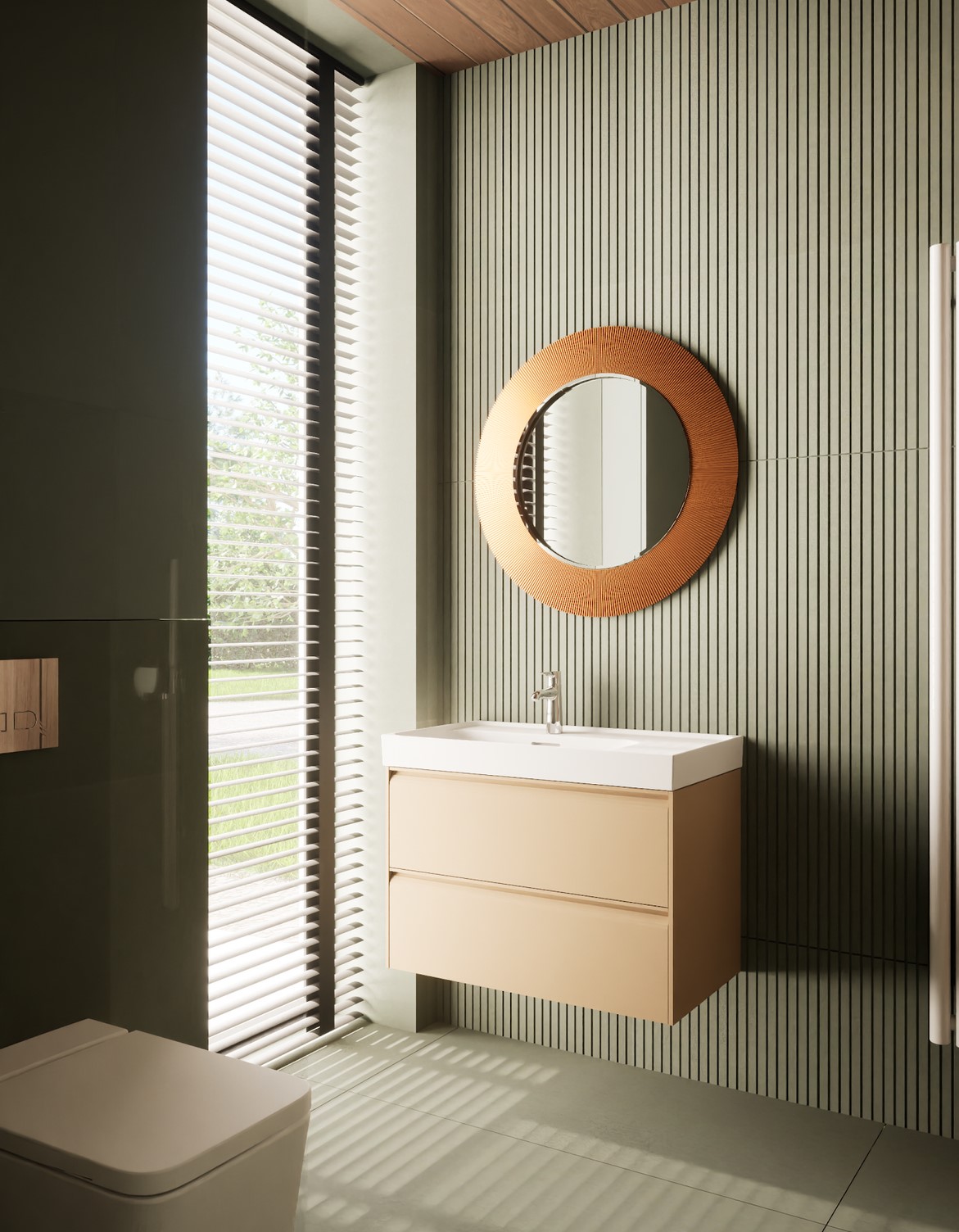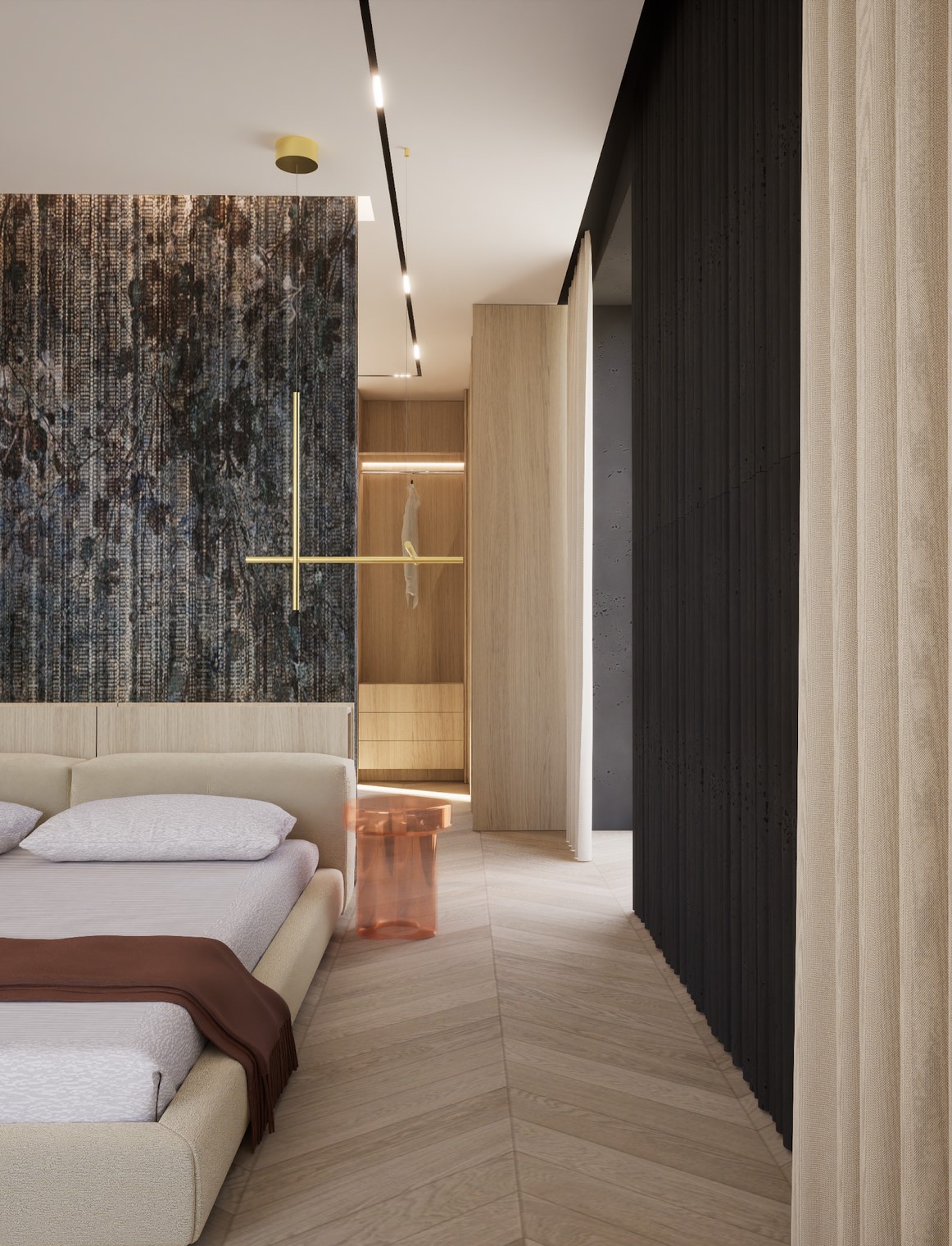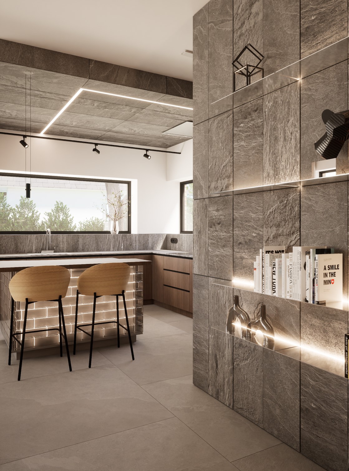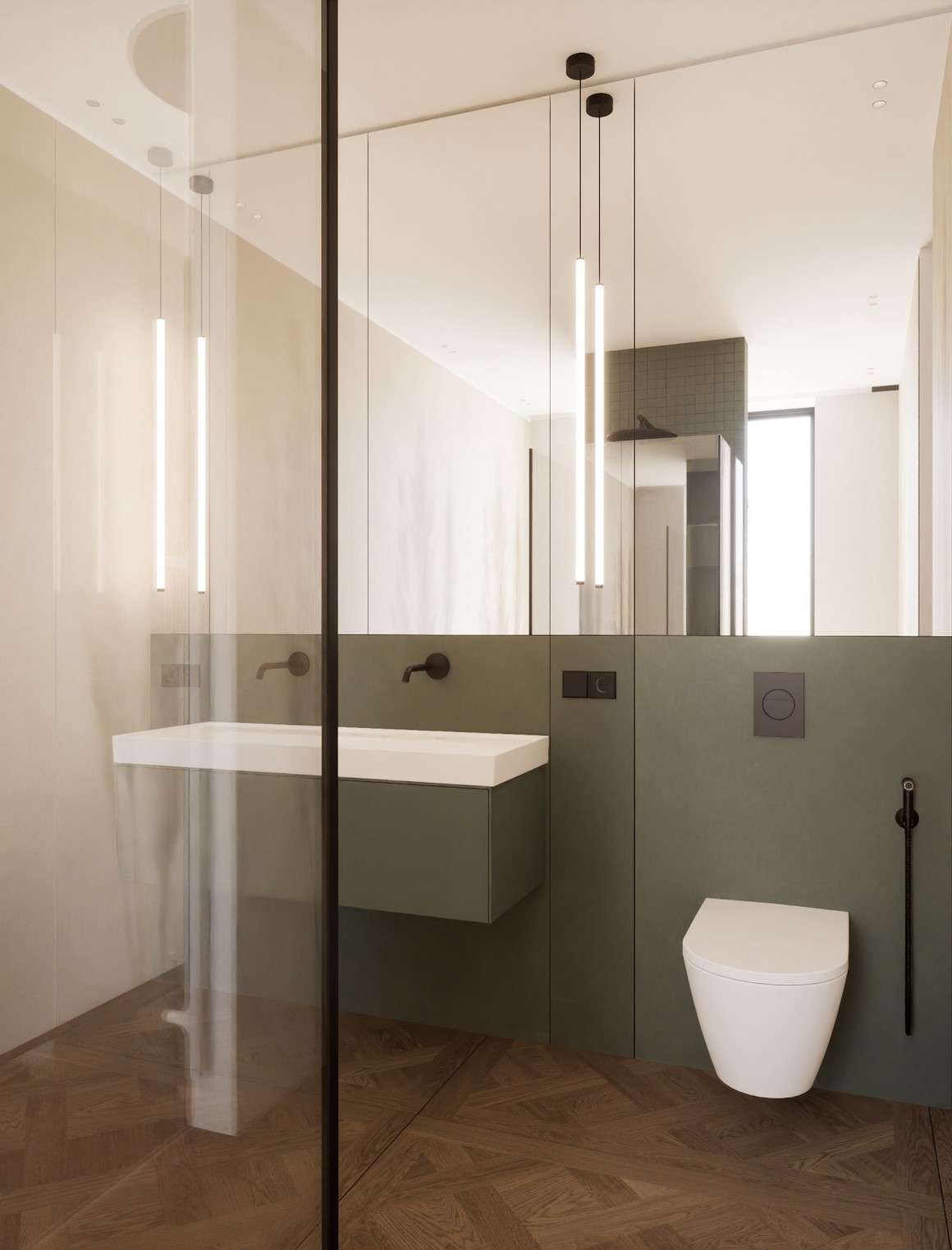 Ten projekt wnętrza to harmonijne połączenie nowoczesnego minimalizmu z ciepłem naturalnych materiałów. Ciepły, orzechowy odcień drewna zestawiony z surowym kamieniem nadaje przestrzeni wyrafinowany, a zarazem przytulny charakter. Centralnym punktem strefy dziennej jest funkcjonalna kuchnia z efektowną wyspą, subtelnie podświetloną szklanymi cegłami. Otwarta przestrzeń salonu i jadalni płynnie łączy się z otoczeniem dzięki dużym przeszkleniom, które wypełniają wnętrze naturalnym światłem. Całość dopełniają ciepłe beże i delikatne akcenty kolorystyczne – jak ceglastoczerwone krzesła – dodające aranżacji charakteru i domowej atmosfery. Łazienka I – inspirowana naturą i spokojem Minimalistyczna przestrzeń, w której zgaszona zieleń, drewno oraz subtelne wzory traw na płytkach tworzą atmosferę relaksu. Głównym punktem jest wanna wolnostojąca ustawiona tak, aby z jej poziomu można było podziwiać widok na sąsiadujący las. Nowoczesne formy i naturalne materiały łączą się tu w harmonijną całość, idealną do wyciszenia i codziennego odpoczynku. Łazienka II – w naturalnych tonach Połączenie drewna, ryflowanych zielonych płytek i jasnych mebli tworzy elegancką i spokojną przestrzeń. Minimalistyczny design podkreślają proste formy i przemyślane detale, dzięki czemu wnętrze pozostaje zarówno funkcjonalne, jak i estetyczne. Master bedroom inwestorów Nowoczesna i pełna światła dzięki dużym przeszkleniom, sprzyja harmonii oraz poczuciu bliskości z naturą. Jako master bedroom oferuje wydzieloną strefę wypoczynkową, przestronną garderobę oraz prywatną łazienkę. Jasne wykończenia kontrastują z ciemną tapetą oraz czarnymi, trójwymiarowymi płytami betonowymi, co równoważy ilość światła i wycisza pomieszczenie.