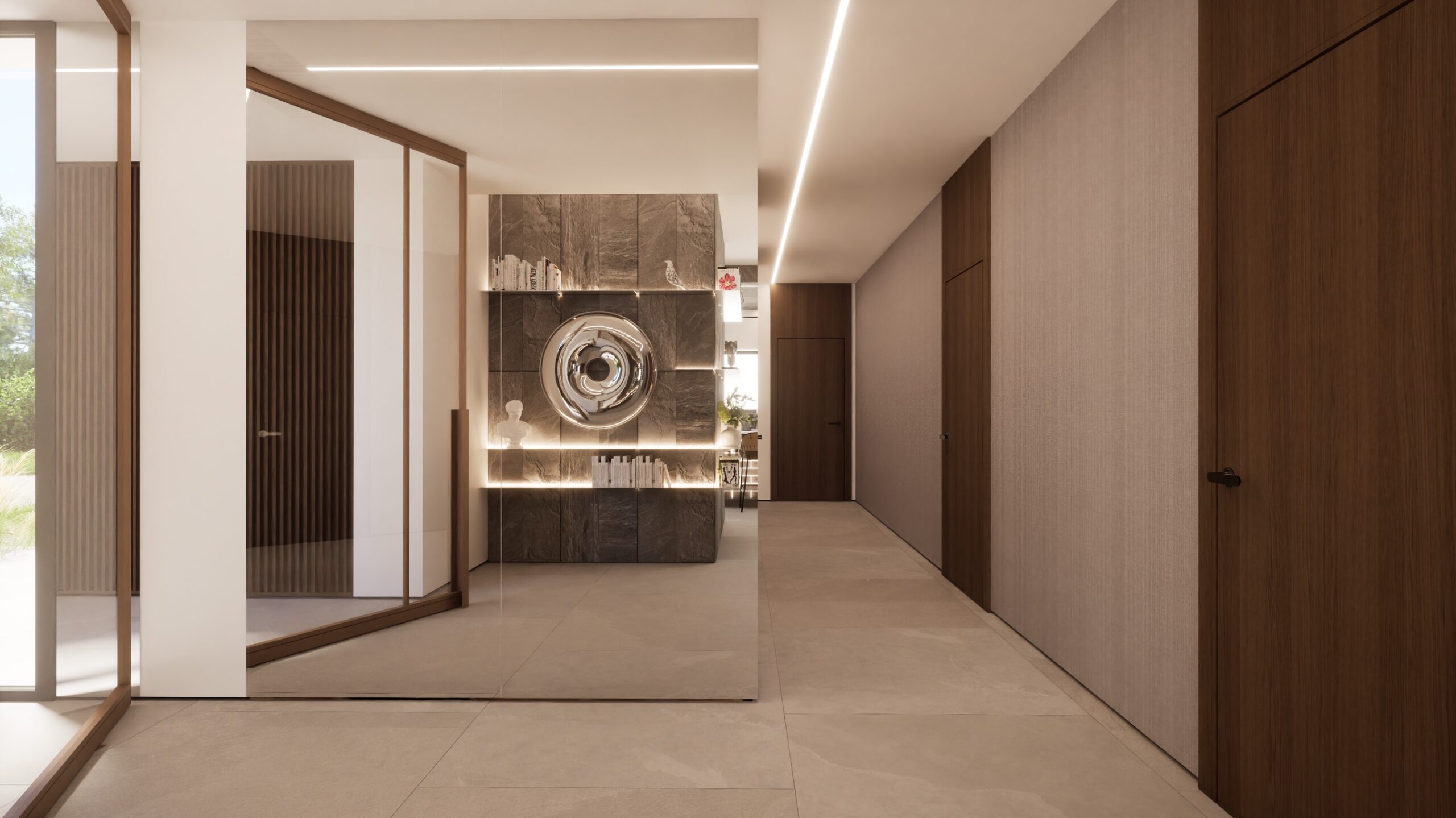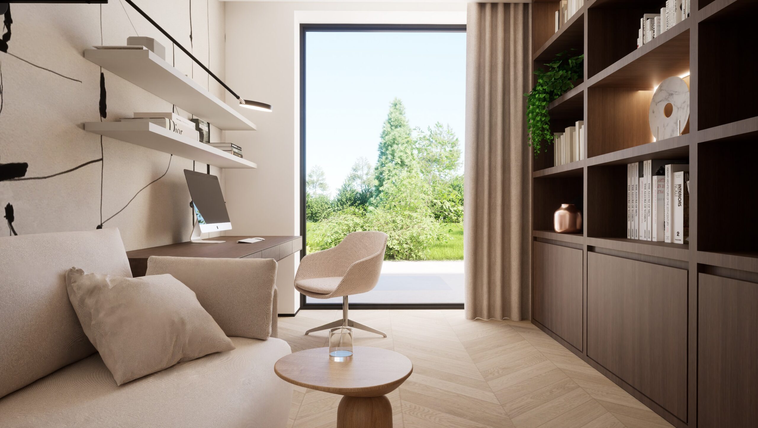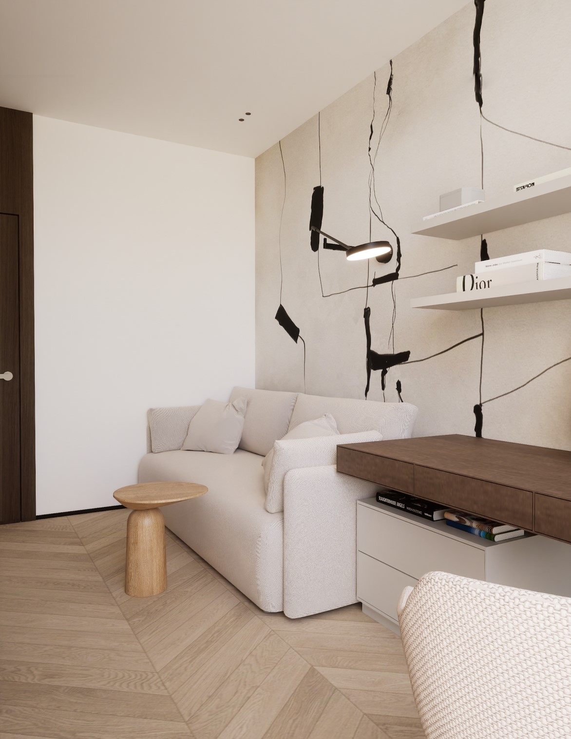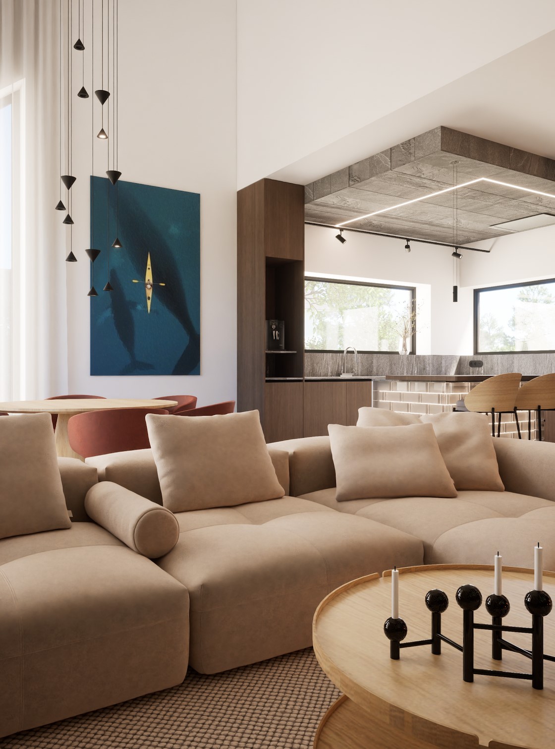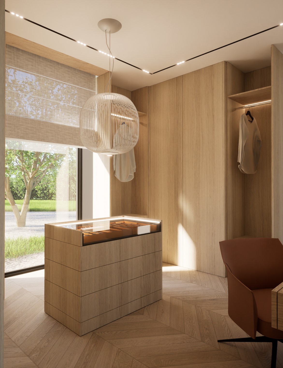 Ten projekt wnętrza to harmonijne połączenie nowoczesnego minimalizmu z ciepłem naturalnych materiałów. Ciepły, orzechowy odcień drewna zestawiony z surowym kamieniem nadaje przestrzeni wyrafinowany, a zarazem przytulny charakter. Centralnym punktem strefy dziennej jest funkcjonalna kuchnia z efektowną wyspą, subtelnie podświetloną szklanymi cegłami. Otwarta przestrzeń salonu i jadalni płynnie łączy się z otoczeniem dzięki dużym przeszkleniom, które wypełniają wnętrze naturalnym światłem. Całość dopełniają ciepłe beże i delikatne akcenty kolorystyczne – jak ceglastoczerwone krzesła – dodające aranżacji charakteru i domowej atmosfery. Łazienka I – inspirowana naturą i spokojem Minimalistyczna przestrzeń, w której zgaszona zieleń, drewno oraz subtelne wzory traw na płytkach tworzą atmosferę relaksu. Głównym punktem jest wanna wolnostojąca ustawiona tak, aby z jej poziomu można było podziwiać widok na sąsiadujący las. Nowoczesne formy i naturalne materiały łączą się tu w harmonijną całość, idealną do wyciszenia i codziennego odpoczynku. Łazienka II – w naturalnych tonach Połączenie drewna, ryflowanych zielonych płytek i jasnych mebli tworzy elegancką i spokojną przestrzeń. Minimalistyczny design podkreślają proste formy i przemyślane detale, dzięki czemu wnętrze pozostaje zarówno funkcjonalne, jak i estetyczne. Master bedroom inwestorów Nowoczesna i pełna światła dzięki dużym przeszkleniom, sprzyja harmonii oraz poczuciu bliskości z naturą. Jako master bedroom oferuje wydzieloną strefę wypoczynkową, przestronną garderobę oraz prywatną łazienkę. Jasne wykończenia kontrastują z ciemną tapetą oraz czarnymi, trójwymiarowymi płytami betonowymi, co równoważy ilość światła i wycisza pomieszczenie.