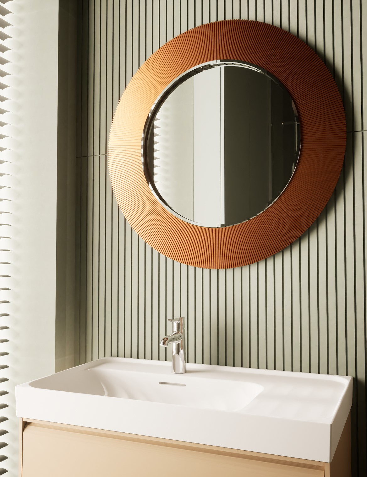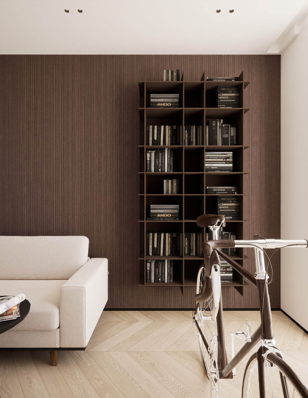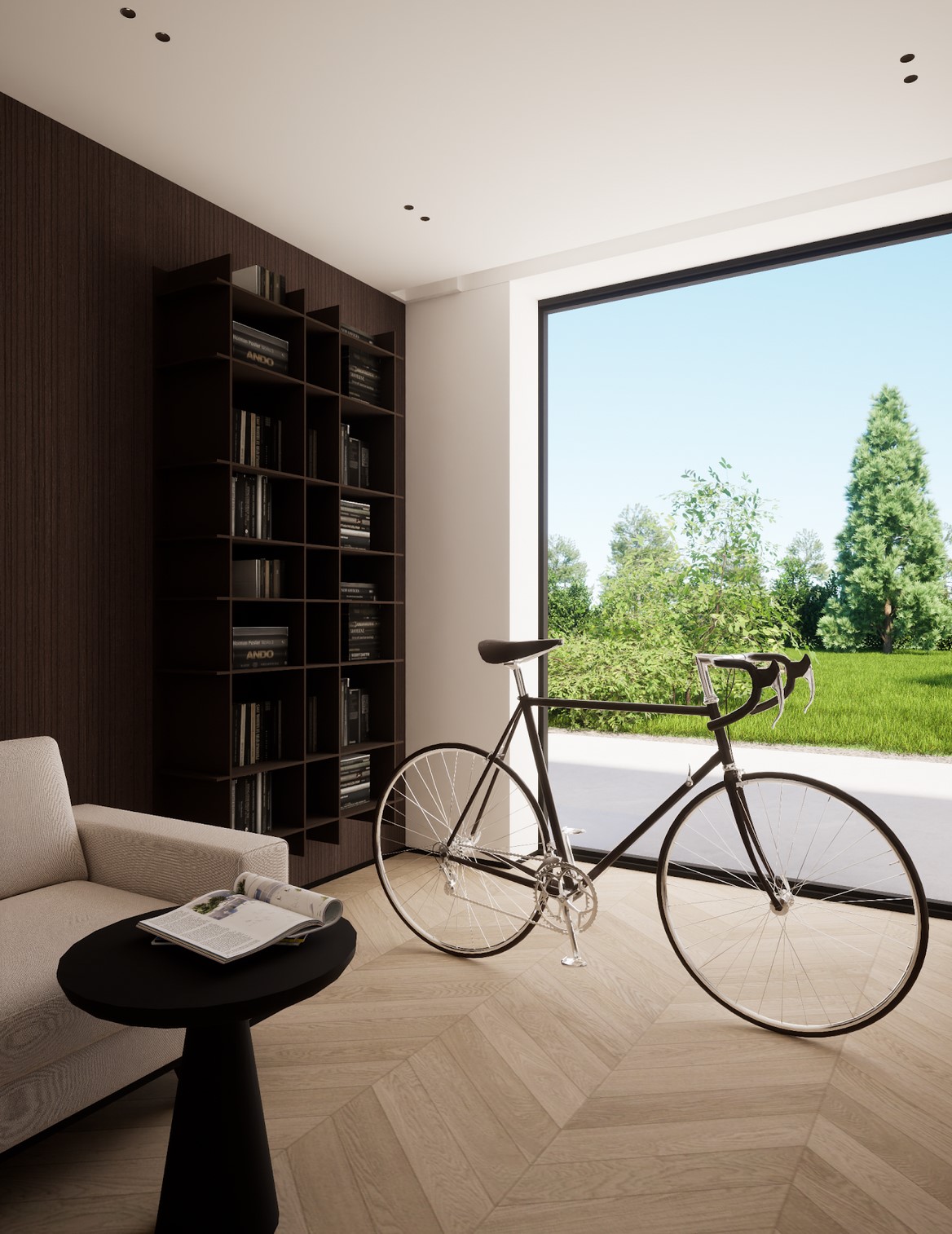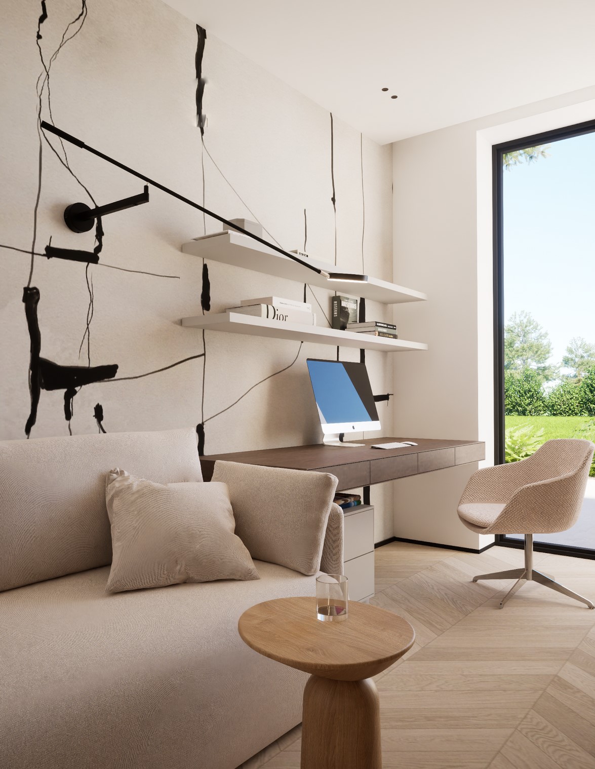 Ten projekt wnętrza to harmonijne połączenie nowoczesnego minimalizmu z ciepłem naturalnych materiałów. Ciepły, orzechowy odcień drewna zestawiony z surowym kamieniem nadaje przestrzeni wyrafinowany, a zarazem przytulny charakter. Centralnym punktem strefy dziennej jest funkcjonalna kuchnia z efektowną wyspą, subtelnie podświetloną szklanymi cegłami. Otwarta przestrzeń salonu i jadalni płynnie łączy się z otoczeniem dzięki dużym przeszkleniom, które wypełniają wnętrze naturalnym światłem. Całość dopełniają ciepłe beże i delikatne akcenty kolorystyczne – jak ceglastoczerwone krzesła – dodające aranżacji charakteru i domowej atmosfery. Łazienka I – inspirowana naturą i spokojem Minimalistyczna przestrzeń, w której zgaszona zieleń, drewno oraz subtelne wzory traw na płytkach tworzą atmosferę relaksu. Głównym punktem jest wanna wolnostojąca ustawiona tak, aby z jej poziomu można było podziwiać widok na sąsiadujący las. Nowoczesne formy i naturalne materiały łączą się tu w harmonijną całość, idealną do wyciszenia i codziennego odpoczynku. Łazienka II – w naturalnych tonach Połączenie drewna, ryflowanych zielonych płytek i jasnych mebli tworzy elegancką i spokojną przestrzeń. Minimalistyczny design podkreślają proste formy i przemyślane detale, dzięki czemu wnętrze pozostaje zarówno funkcjonalne, jak i estetyczne. Master bedroom inwestorów Nowoczesna i pełna światła dzięki dużym przeszkleniom, sprzyja harmonii oraz poczuciu bliskości z naturą. Jako master bedroom oferuje wydzieloną strefę wypoczynkową, przestronną garderobę oraz prywatną łazienkę. Jasne wykończenia kontrastują z ciemną tapetą oraz czarnymi, trójwymiarowymi płytami betonowymi, co równoważy ilość światła i wycisza pomieszczenie.