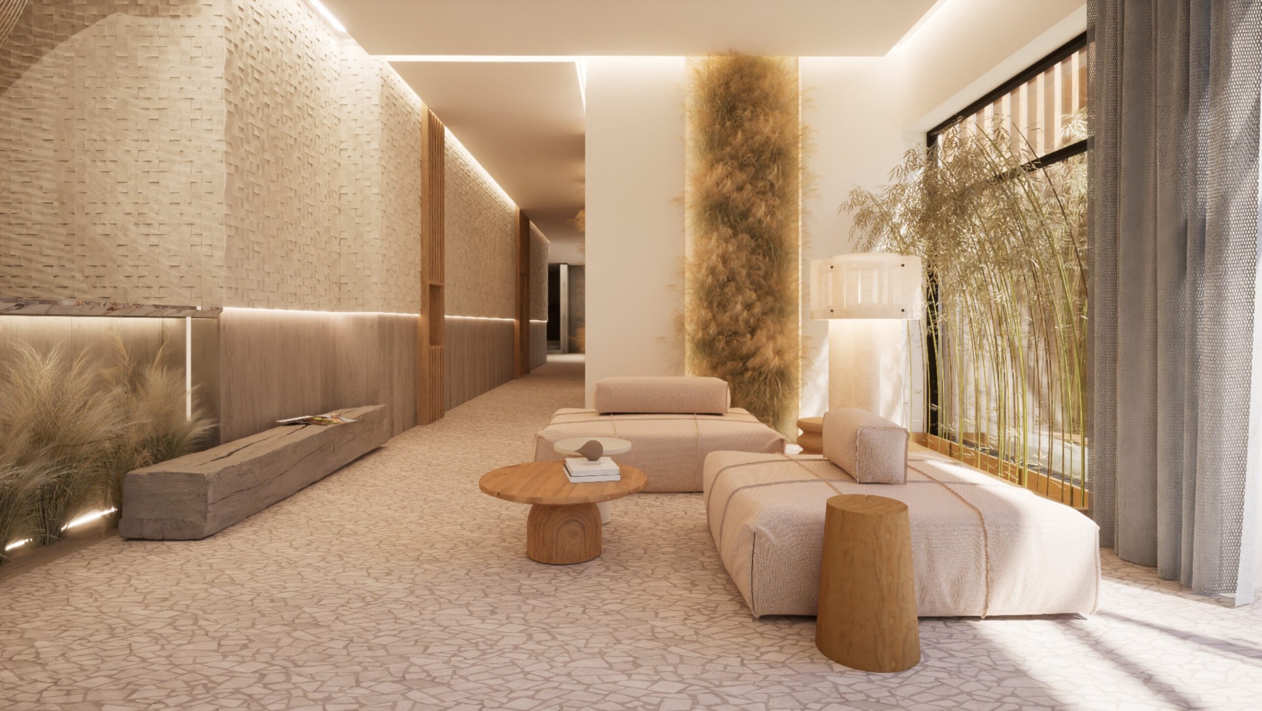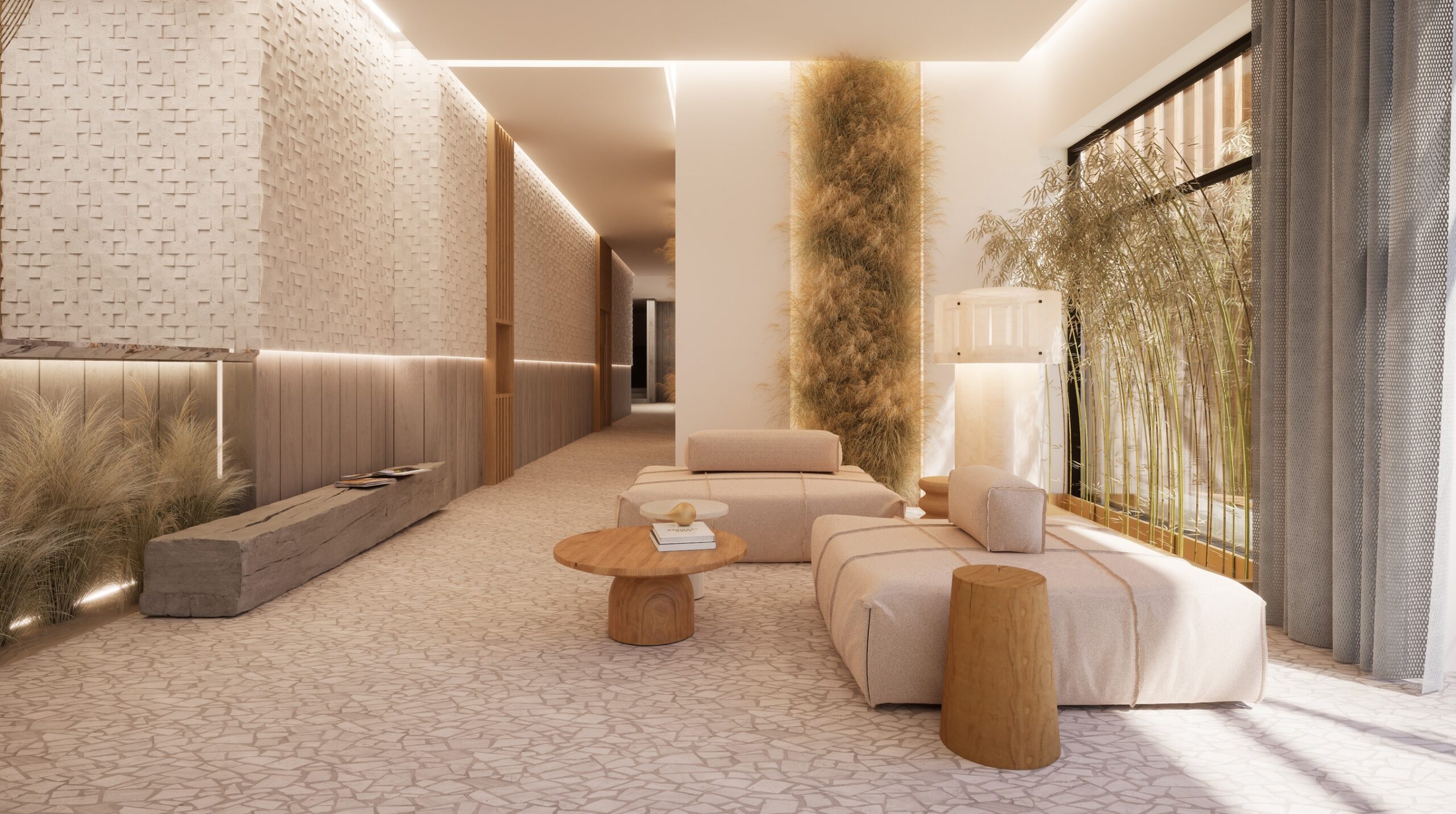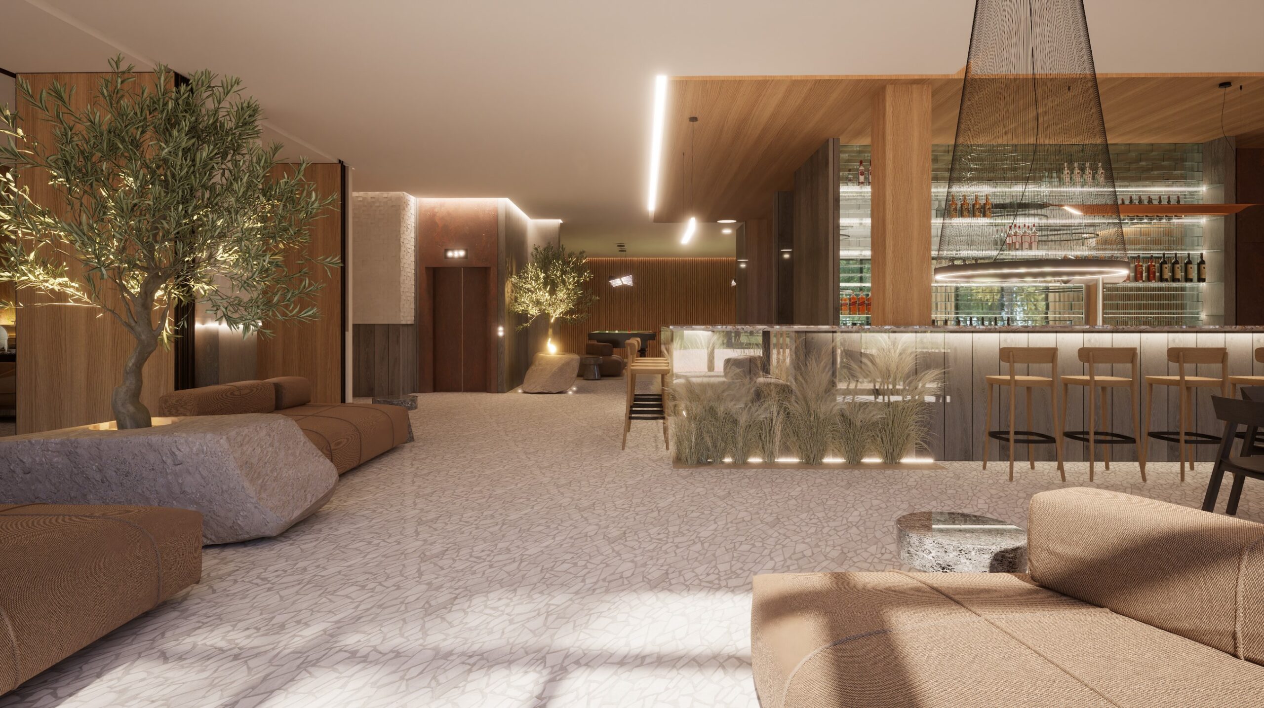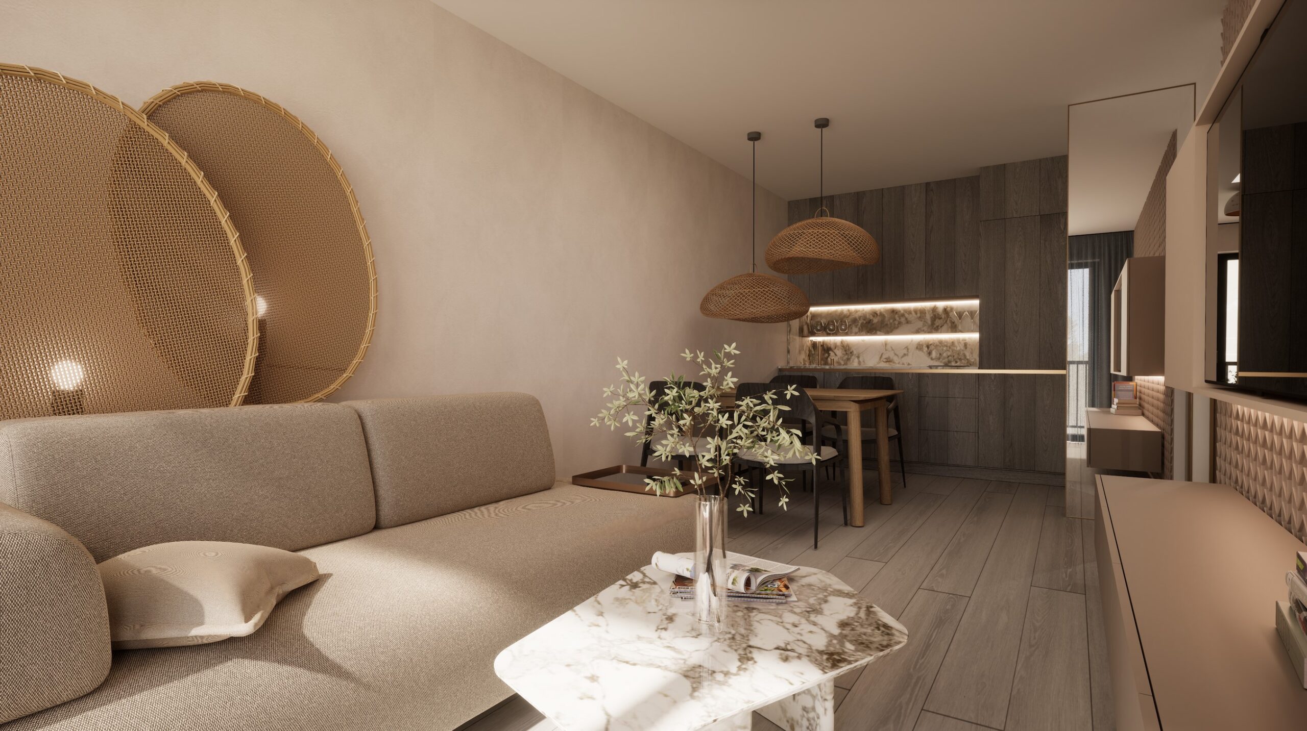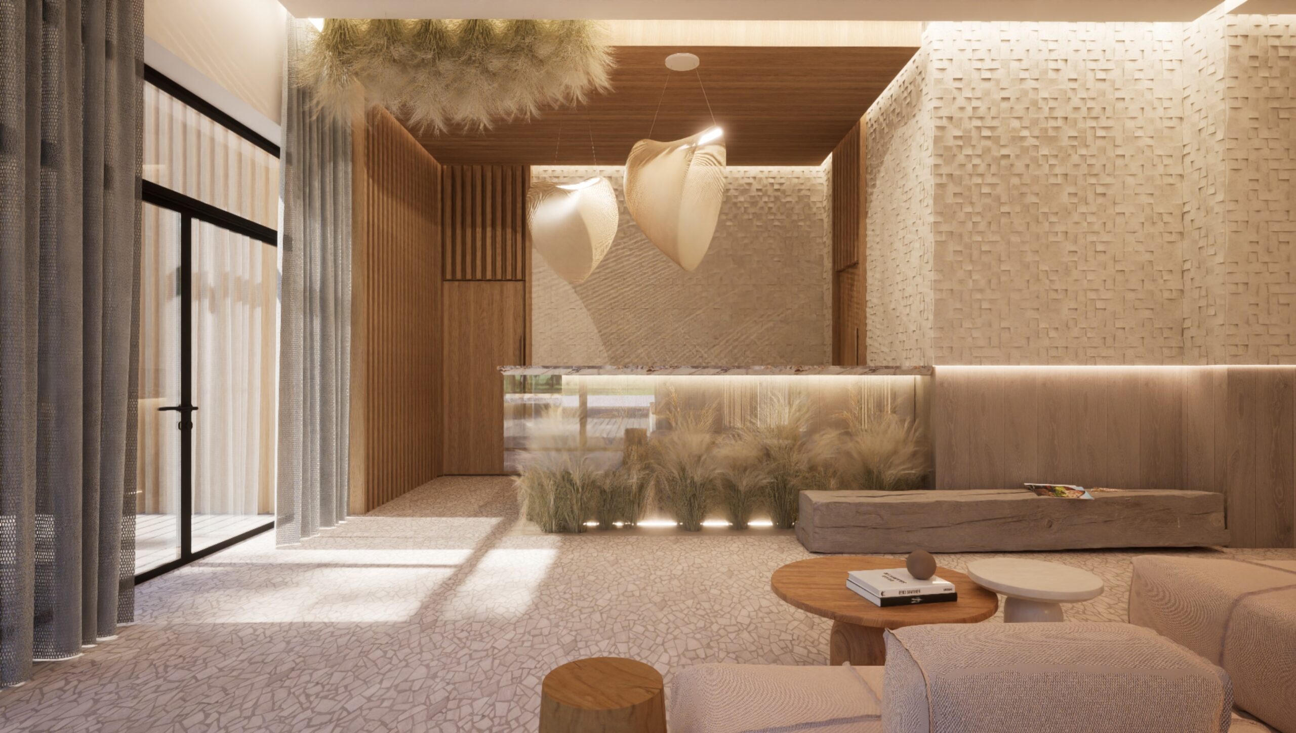 Projekt wnętrz nadmorskiego pensjonatu został zaprojektowany tak, aby połączyć naturalny urok wybrzeża z eleganckim, współczesnym luksusem. We wnętrzu dominują betonowe płyty 3D w bardzo jasnej tonacji, które nadają ścianom subtelną, rzeźbiarską strukturę, przywodzącą na myśl fale morskie i miękko modelowany przez wiatr piasek. Podłogi wykończono białym lastryko z drobnym, kamiennym kruszywem, co dodaje całości świeżości i świetlistego charakteru. W przestrzeń wkomponowano trawy ozdobne – które wprowadzają do środka klimat wydm oraz miękko przełamują geometryczną linię architektury. Paleta kolorów jest utrzymana w odcieniach piasku, beżu, ciepłej bieli i jasnych szarości, uzupełniona naturalnym drewnem. Centralną przestrzeń stanowi lobby, które pełni funkcję baru, poczekalni i jadalni. Dzięki otwartej aranżacji, goście mogą swobodnie przechodzić od porannej kawy, przez chwilę relaksu z książką, po wieczorne rozmowy przy winie. Meble tapicerowane wykonano z miękkich, naturalnych tkanin w neutralnych tonach, a oświetlenie – w formie delikatnych, ciepłych lamp wiszących i ukrytych podświetleń – tworzy nastrój dyskretnego luksusu. Całość jest jednocześnie naturalna, przestronna i przyjazna, a zarazem wyrafinowana, tak by każdy gość czuł się jak w nadmorskim azylu o hotelowym standardzie.
