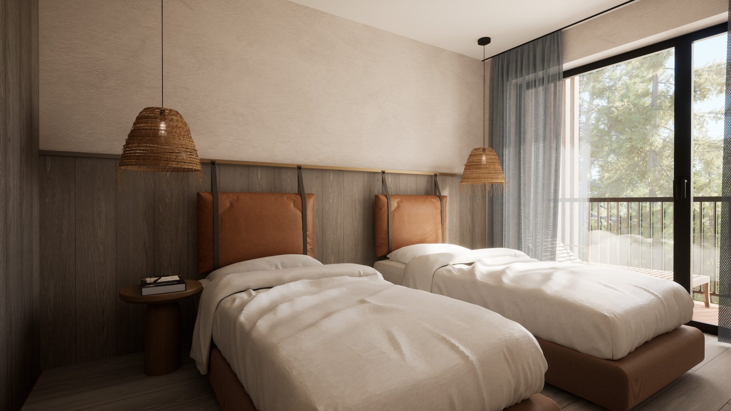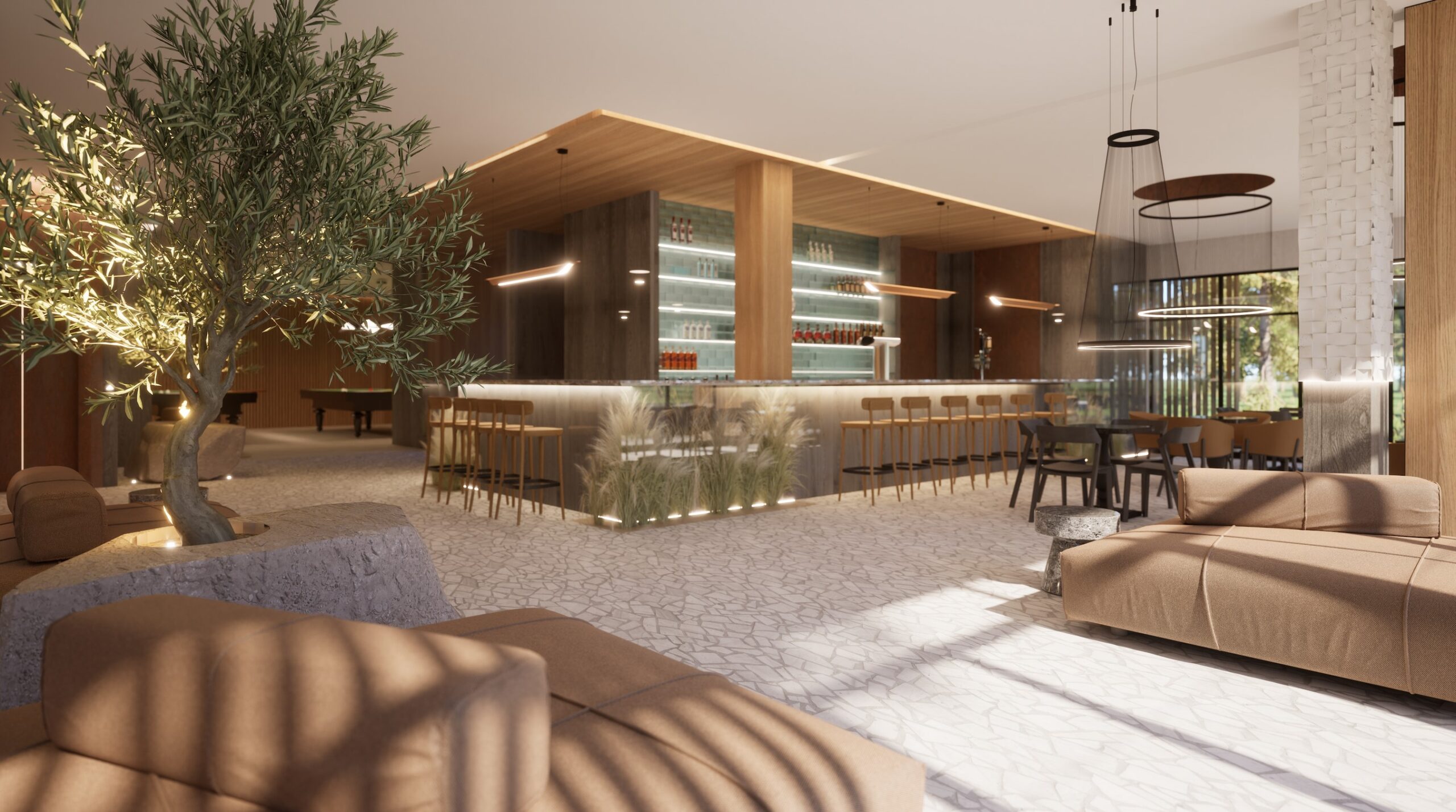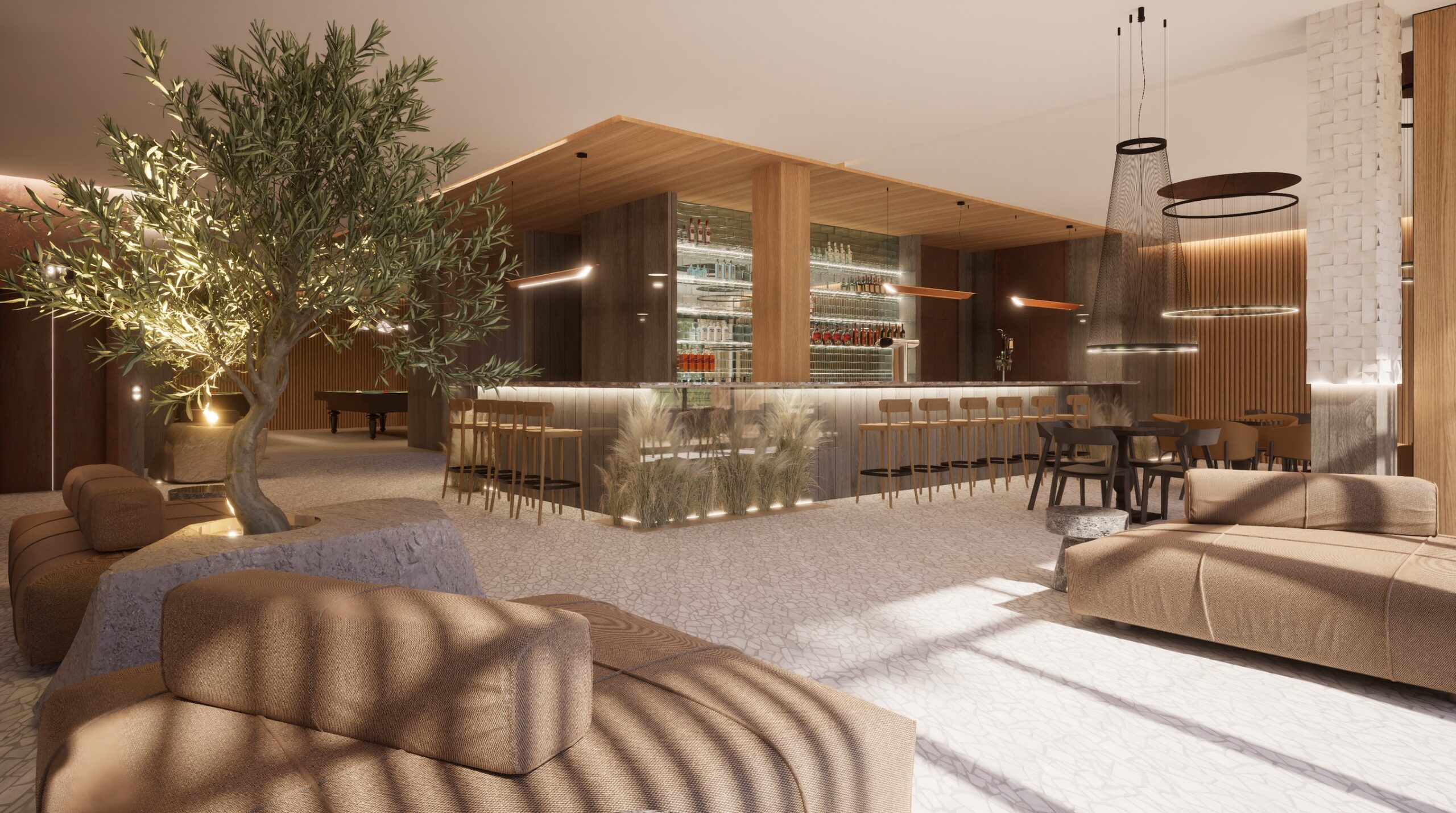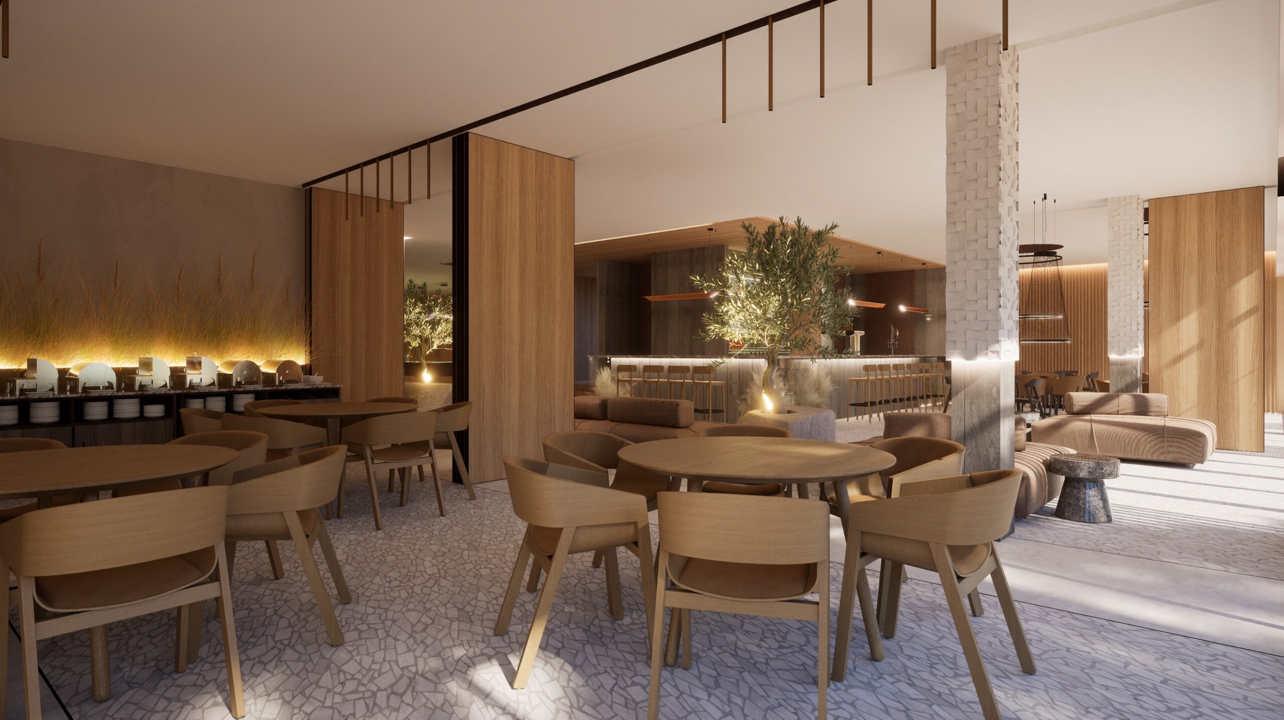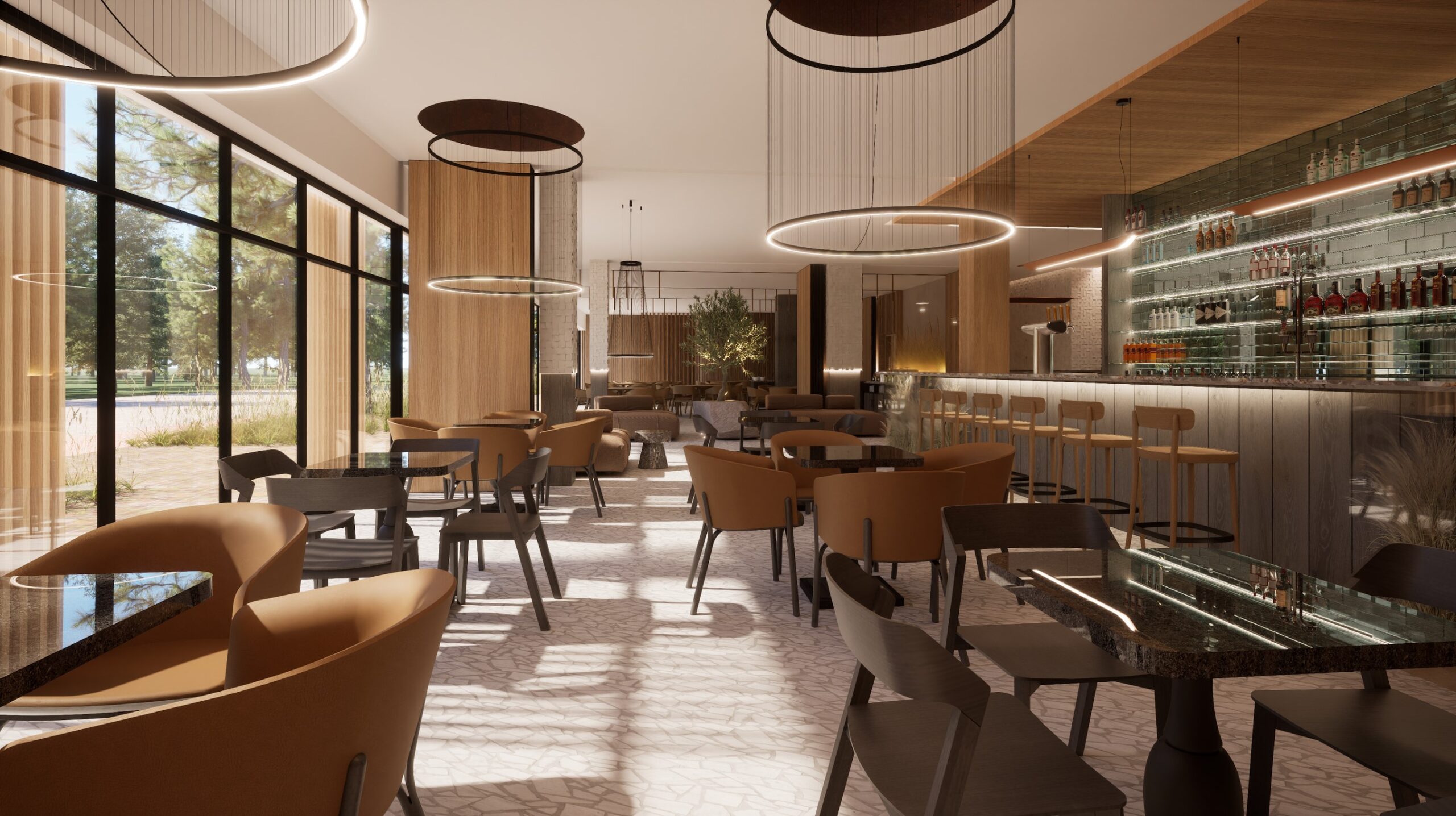 Projekt wnętrz nadmorskiego pensjonatu został zaprojektowany tak, aby połączyć naturalny urok wybrzeża z eleganckim, współczesnym luksusem. We wnętrzu dominują betonowe płyty 3D w bardzo jasnej tonacji, które nadają ścianom subtelną, rzeźbiarską strukturę, przywodzącą na myśl fale morskie i miękko modelowany przez wiatr piasek. Podłogi wykończono białym lastryko z drobnym, kamiennym kruszywem, co dodaje całości świeżości i świetlistego charakteru. W przestrzeń wkomponowano trawy ozdobne – które wprowadzają do środka klimat wydm oraz miękko przełamują geometryczną linię architektury. Paleta kolorów jest utrzymana w odcieniach piasku, beżu, ciepłej bieli i jasnych szarości, uzupełniona naturalnym drewnem. Centralną przestrzeń stanowi lobby, które pełni funkcję baru, poczekalni i jadalni. Dzięki otwartej aranżacji, goście mogą swobodnie przechodzić od porannej kawy, przez chwilę relaksu z książką, po wieczorne rozmowy przy winie. Meble tapicerowane wykonano z miękkich, naturalnych tkanin w neutralnych tonach, a oświetlenie – w formie delikatnych, ciepłych lamp wiszących i ukrytych podświetleń – tworzy nastrój dyskretnego luksusu. Całość jest jednocześnie naturalna, przestronna i przyjazna, a zarazem wyrafinowana, tak by każdy gość czuł się jak w nadmorskim azylu o hotelowym standardzie.